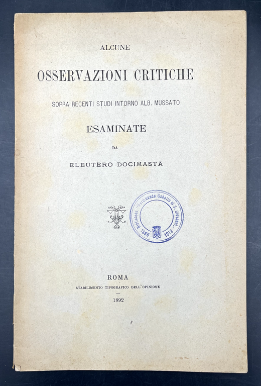 Alcune osservazioni critiche sopra recenti studi intorno Alb. MUSSATO esaminate da Eleutero Docimasta.