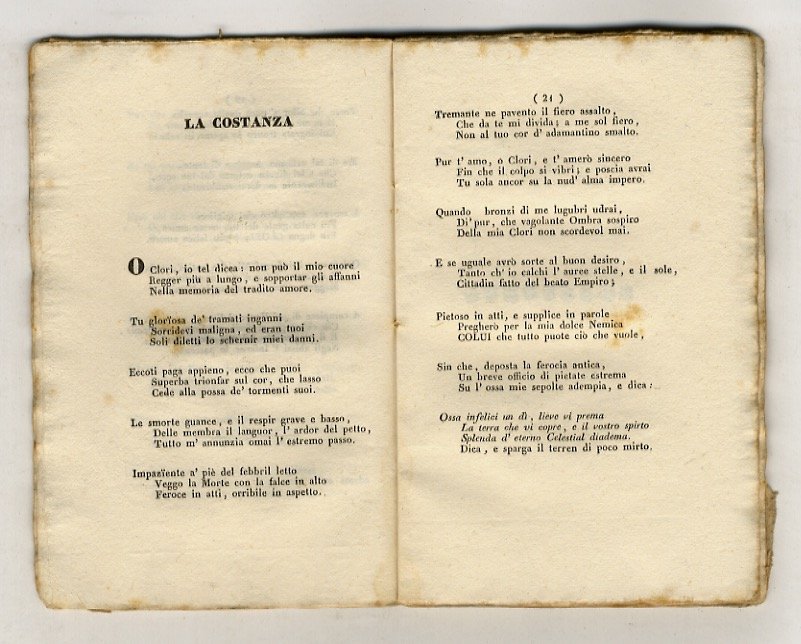 Bologna, alla Volpe, 1834, in-16, brossura muta coeva, pp. 74, [2]. Gora a 5 carte centrali.