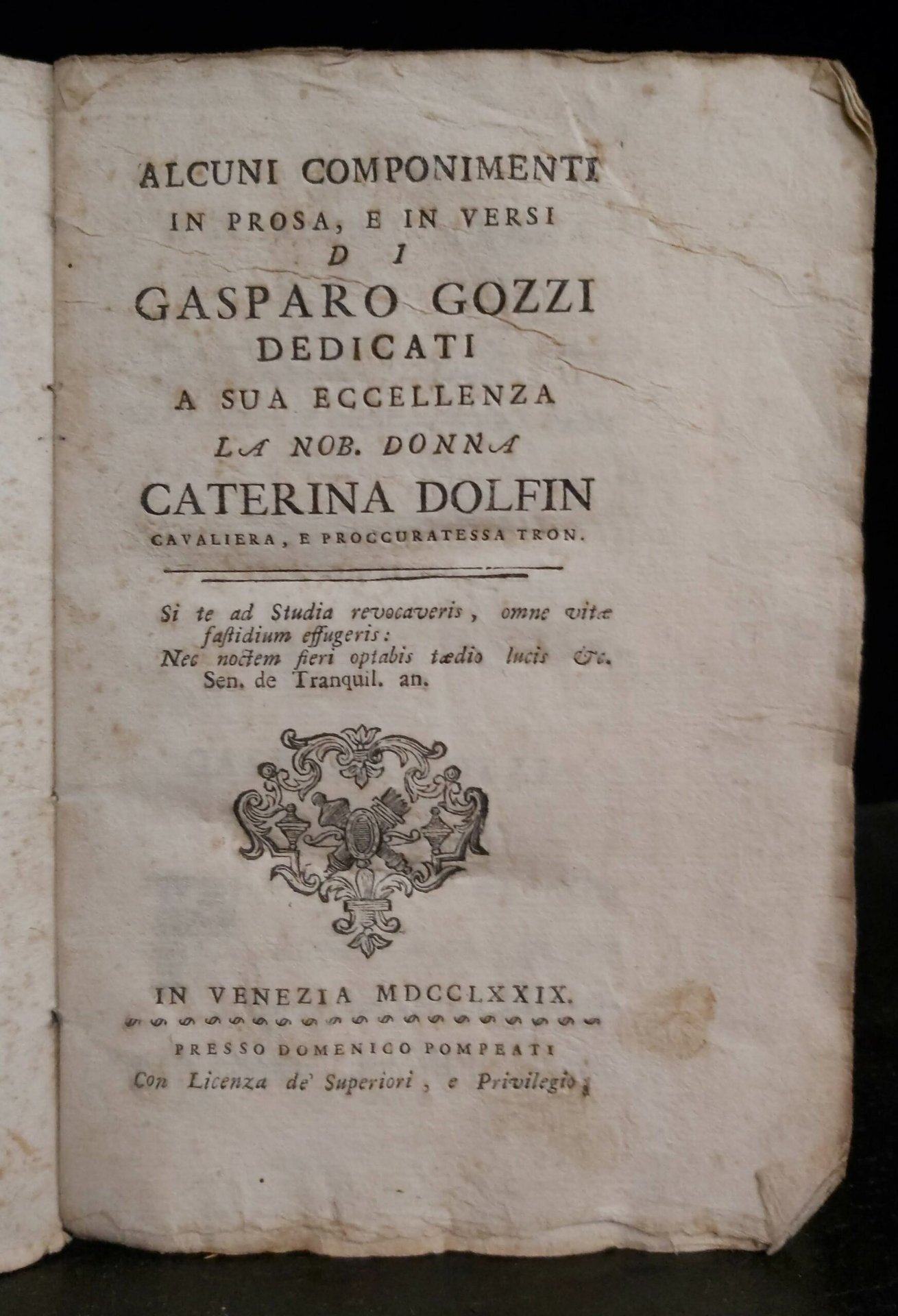 in-16, pp. CXI, leg. cart. rust. coevo. Gamba 2284: “I brevi componimenti che racchiude quest’aureo libretto, non palesano punto né la tarda etè, né l’animo travagliato del loro Autore, anzi taluno può giudicarsi tra i più spiritosi e gentili che mai facesse”. [391]