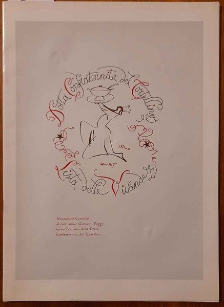 <p>34x24 cm, brossura illustrata di p. 24. Presentazione di Giovanni Poggi, 3 tavole applicate con i nomi dei partecipanti alla cena della Trattoria dei Molinelli di Rioveggio, il menu e la lista dei vini.8 tavole a piena pagina di disegni in color seppia con scritte in rosso; nove pagine con la storia del cibo e la ricetta dei tortellini</p>