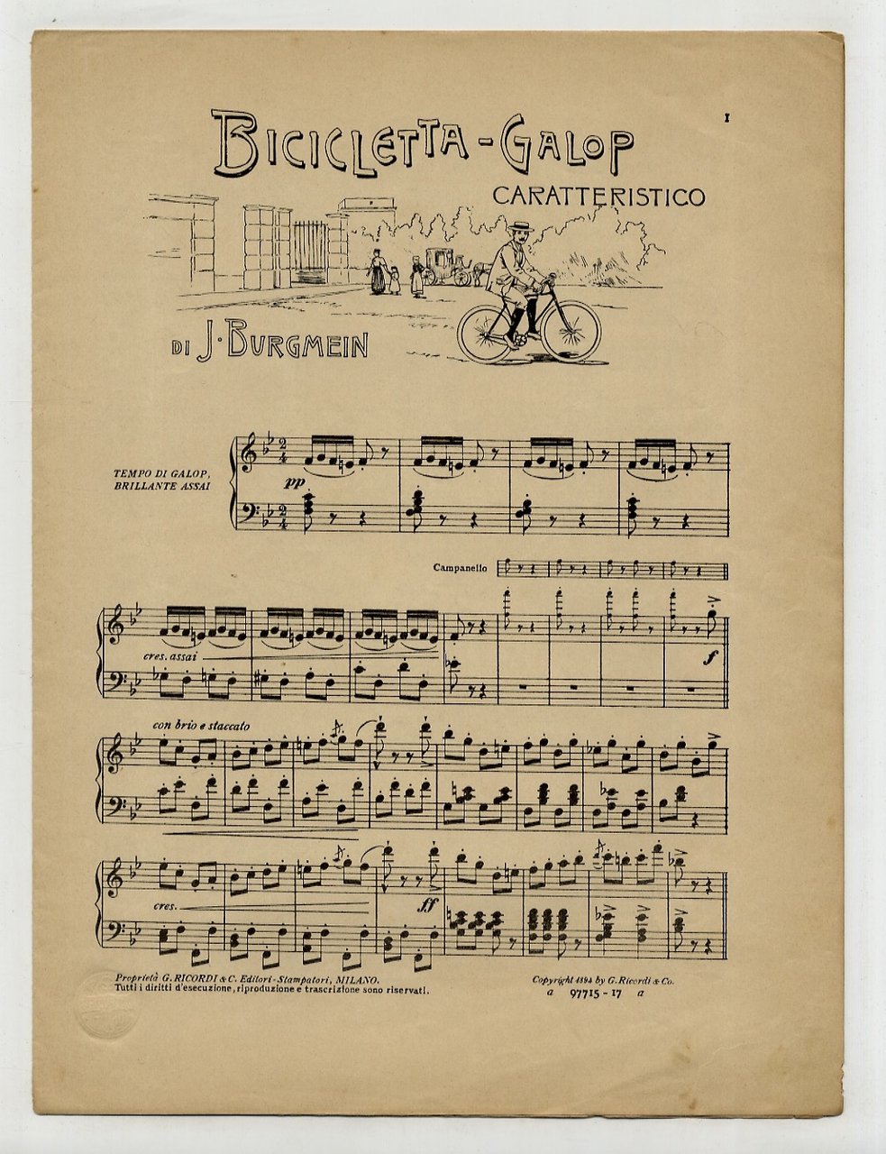 Milano, G. Ricordi & C., [c. 1894], in-4, brossura editoriale con la copertina anteriore figurata in cromolitografia, pp. 8 di musica notata. Con piccole illustrazioni intercalate n.t. Opera musicale che racconta la storia di un ciclista che attraversa la città e la campagna per andare a trovare la sua bella. Bell'esemplare.