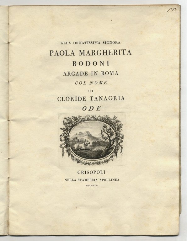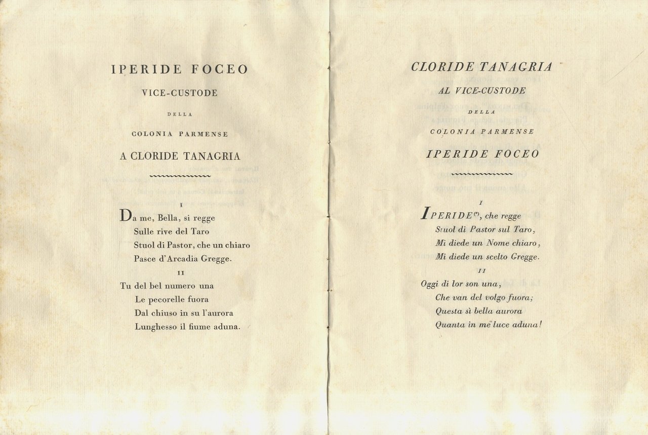 Crisopoli [Parma], nella Stamperia Apollinea [Bodoni], 1792, in-4, brossura decorata novecentesca, pp. 14, [2], l'ultima carta bianca. Con una incisione calcografica sul frontespizio (emblema della colonia parmense dell'Arcadia). Contiene l'ode di Aurelio Bernieri Terrarossa in tondo (Iperide Foceo vice-custode della Colonia parmense a Cloride Tanagria) e l'ode di Margherita Bodoni in corsivo (Cloride Tanagria al vice-custode della Colonia parmense Iperide Foceo). Brooks, n. 466.