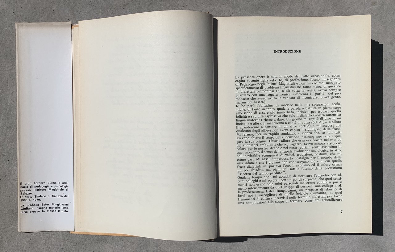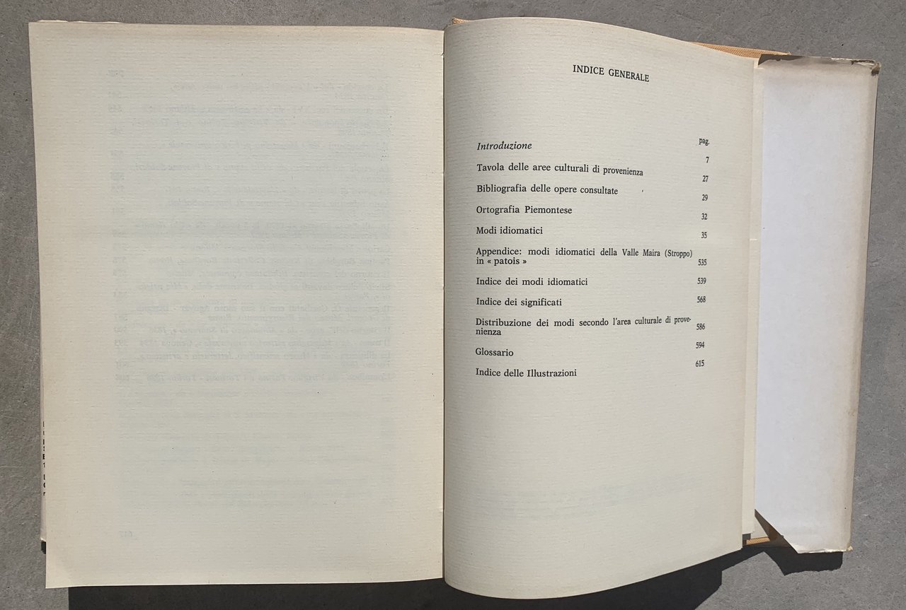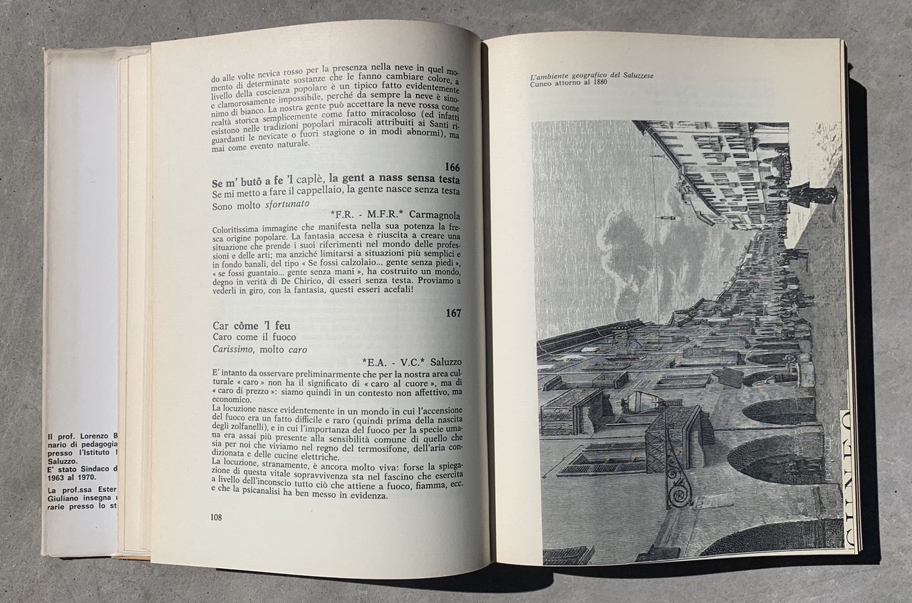 I ed.: 1^ Settembre 1973. Testi dei modi di dire in piemontese-saluzzese/italiano. VIII/626/ cart./ sovraccoperta. Illustrazioni in nero f.t. e una carta geografica in nero con indicazione della zona di ricerca in rosso, ripiegata in fondo al volume. Stato buono (usura della sovraccoperta ai margini - volume nel complesso brunito).