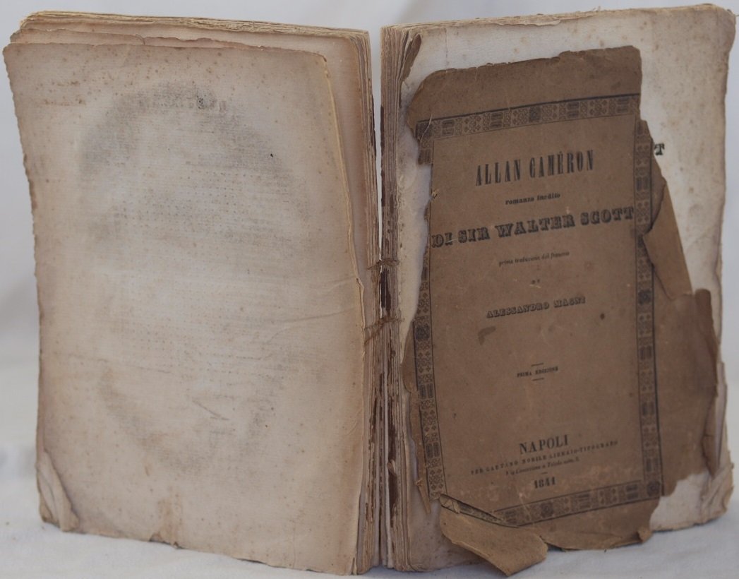 In 8. Dim. 25x18 cm. Pp. 178+(2). Prima edizione napoletana del 1841 del celebre romanzo di Walter Scott (1771-1832) poeta e scrittore scozzese nato ad Edimburgo e morto ad Abbotsford. Traduzione a cura di Alessandro Magni. L'opera è in un volume ed è completa, risulta mancante solo la prima carta bianca. In discrete condizioni. Brossura editoriale in mediocri condizioni generali con usure e parti mancanti ai margini e dorso. Piatto anteriore staccato con parti mancanti, dorso e piatto posteriore assente. Legatura in discrete condizioni. All'interno le pagine si presentano in buone condizioni con fioriture e usure marginali.First neapolitan edition of 1841 of the famous novel by Walter Scott (1771-1832) scottish poet and writer born in Edimburgh and dead in Abbotsford. Translation by Alessandro Magni. the work is in one volume and it is complete, only the first white page is missing. In fair conditions. Editorial cover in poor general conditions with wearings and missing parts in the edges and spine. Front plate detached with missing parts, spine and back plate missing. Binding in fair conditions. Inside pages are in good conditions with foxings and wearings in the edges.