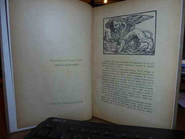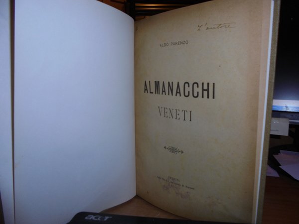 ALDO, PARENZO. Venezia, Stab. Tip. Lit. Successore M. Fontana, 1896. ALMANACCHI VENETI. In-8°, tela con titolo in oro entro tassello al dorso, copertine originali conservate. 91 pp. con alcune illustrazioni n.t. Ottimo esemplare della prima edizione in legatura recente. Raro opuscolo. Neg. mob. rosso