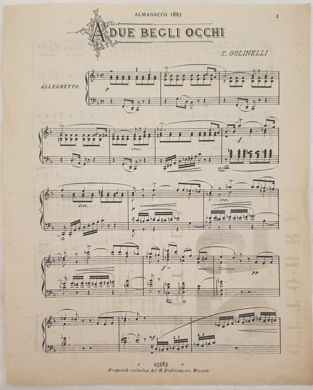 Partitura per pianoforte del 1881 della melodia "A due begli occhi" di S. Golinelli. Dimensioni In 8. cm 25x20. Pp. (2) In buone condizioni. Piccolo strappo marginali.Score for piano of 1881 of melody "A due begli occhi" by S. Golinelli. Size In 8. cm 25x20. Pp. (2) In good conditions. Little tear in the extremity.