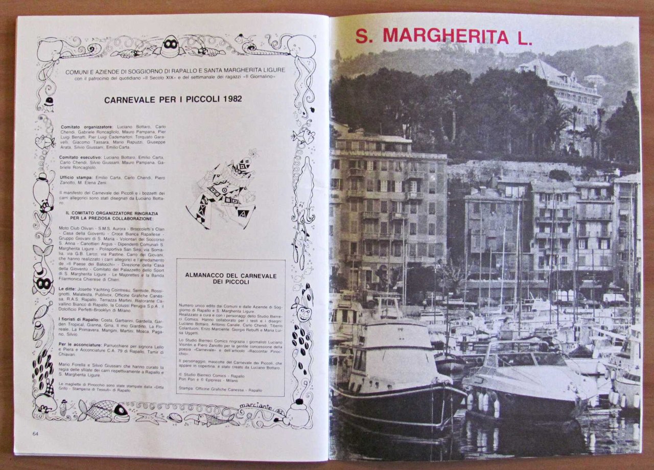 Comuni e aziende di soggiorno di Rapallo e Santa Margherita Ligure con il patrocinio del quotidiano "Il Secolo XIX" e del settimanale dei ragazzi "Il Giornalino". Almanacco del Carnevale per i piccoli. Illustrazioni a fumetti in b/n e a colori in tutte le pagine. Studio Bierreci Comics - Comuni e aziende autonome di soggiorno di Rapallo e S. Margherita Ligure, 1982. Hanno collaborato per i testi e i disegni: Luciano Bottaro, Antonio Canale, Carlo Chendi, Tiberio Colantuoni, Enzo Marciente, Giorgio Rebuffi, Maria Luisa Uggetti. Brossura editoriale con lieve segno di piega. 21x30; pp.64. Ottimo stato. , Ottimo (Fine)