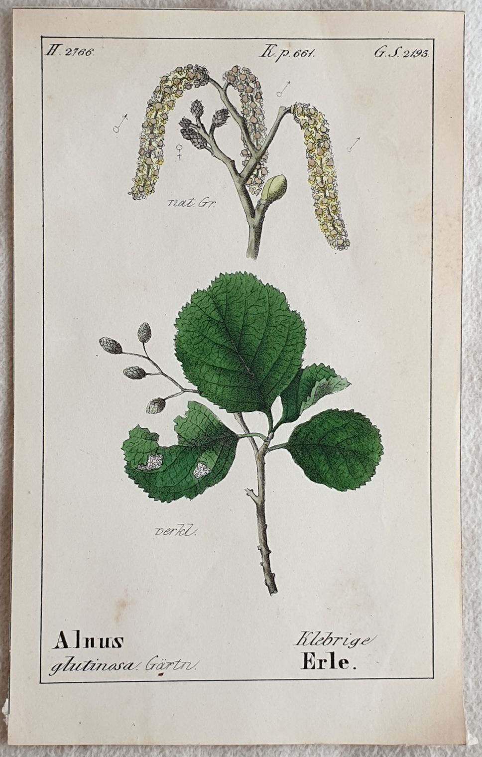 Bella cromolitografia del 1843 tratta dalla celebre opera di botanica "Flora der Schweiz" di Heinrich Romer sulla flora della Svizzera che rappresenta l'ontano nero.<BR>In buone condizioni, qualche fioritura. Segni di colla al verso. TECNICA: Cromolitografia DIMENSIONI FOGLIO: cm 17,5x11 DIMENSIONI INCISIONE: cm 15,5x9,5 EPOCA: 1843 CONDIZIONI: Buone condizioni, qualche fioritura. Resto di colla al verso.Beautiful chromolythography of 1843 taken form the famous work of botany "Flora der Schweiz" by Heinrich Romer about flowers of Switzerland representing the common alder. In good conditions, some foxings. Glue signs in the verso of page Alnus glutinosa TECHNIQUE: Lytography PAGE SIZE: cm 17,5x11 PRINT'S SIZE: cm 15,5x9,5 PERIOD: 1843 CONDITION: good conditions with some foxings. Little tears in the lower edge. Glue signs in the verso of page.