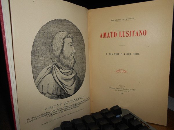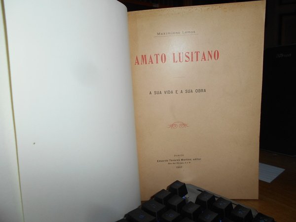 LEMOS MAXIMIANO. Porto, Eduardo Tavares Martins Editor, 1907. AMATO LUSITANO a sua vida e a sua obra. In-8°, tela rossa con titolo in oro entro tassello al dorso, brossure originali conservate. 212 pp. con ritratto in antiporta. Ottimo esemplare in legatura anni '60 con le copertine originali conservate. Neg. mob. rosso