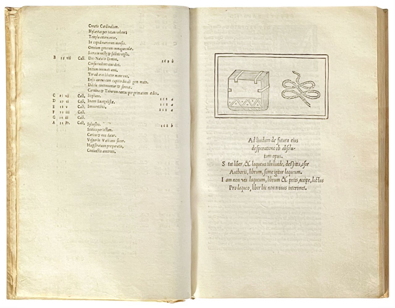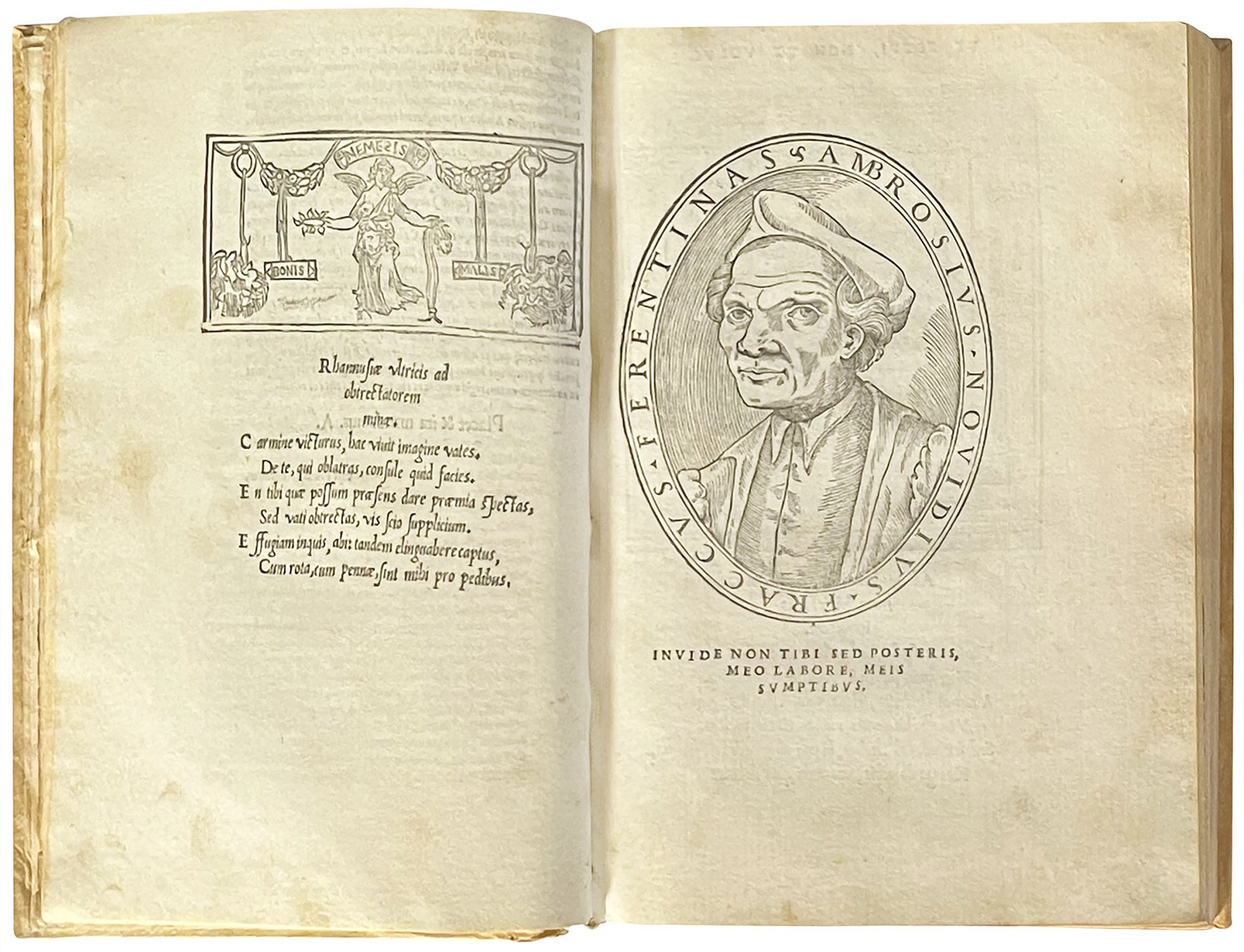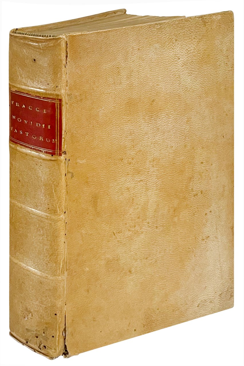 4to (226x160 mm). [16], 1-22, [2], 23-30, [2], 31-169, [1] leaves. Collation: *-****4 A-E4 F6 G4 H6 I-Z4 AA-SS4 TT6. Architectural title border with figures. On the shields on the pedestals of the lateral columns are the arms of Ferentino, Fracco's birthplace. On leaf ****2r is a woodcut of a book and a rope with a quatrain below. On leaf ****3v is a woodcut figure of Nemesis with verse below, facing a full-page medallion portrait of the author on leaf ****4r. A large woodcut on the verso of leaf ****4 shows the author presenting his book to Pope Paul III who has the emperor Charles V and a king (François I?) at either side. With 12 small woodcut illustrations in text, one at the beginning of each book, each in three compartments, with a center figure of a saint and side figures to show the ancient Roman gods and scenes for Christian feast days for the months. One marginal diagram on leaf A2r. Woodcut initials. Register and colophon on l. TT6r. Blado's eagle device on last leaf verso. Italic letter with roman capitals, small italic marginalia. With manuscript corrections throughout the text as probably in all copies. 19th-century stiff vellum, red morocco lettering piece on spine (tiny worm holes along the joint, front joint slightly cracked). Contemporary ownership entry inked out on the title page, later entry (“Juris Caroli Allodi”) on the front flyleaf. First leaves slightly soiled, occasional marginal staining, tears repaired to l. O3 with no loss of text, marginal tear to l. PP3 not affecting the text, all in all a good copy.