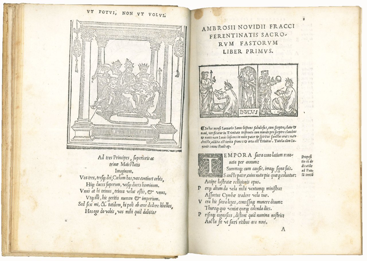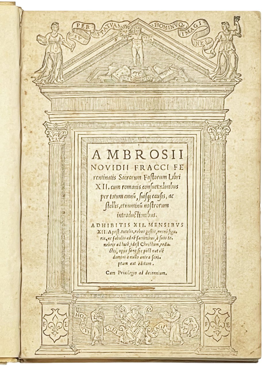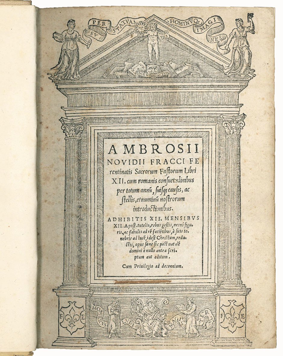 Ambrosii Novidii Fracci Ferentinatis Sacrorum fastorum libri XII. cum romanis consuetudinibus per totum annum, suisque causis, ac stellis, et numinum nostrorum introductionibus [...] Colophon: Excussum Romae, apud. M. Antonium Bladum Asulanum S.D.N. Papae, & Camerae Apostolicae Typographum, XV. Calendis Iunij. M.D.XLVIII
