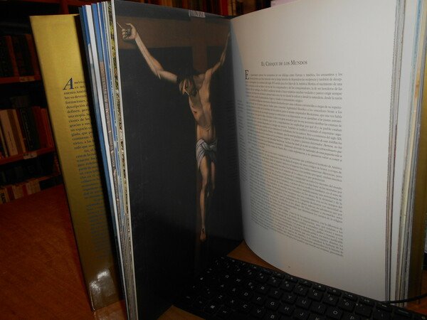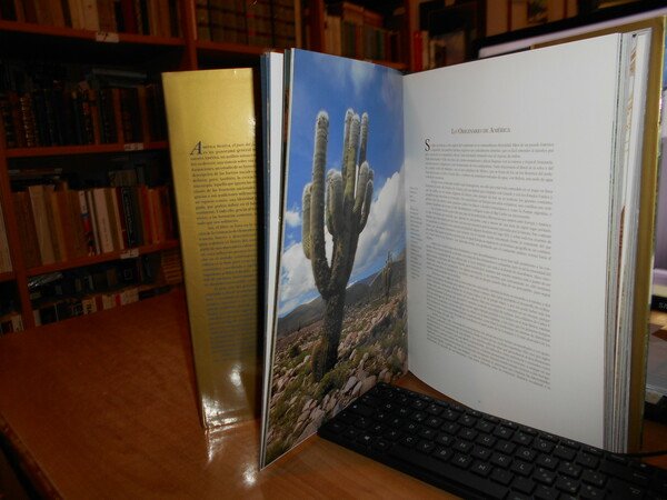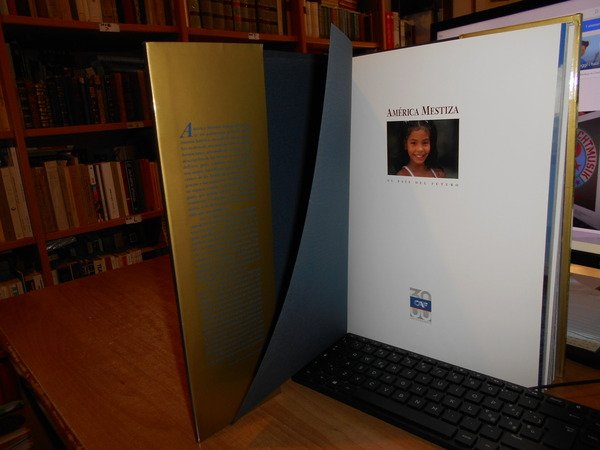Textos de William Ospina. América Mestiza. El país del futuro. Testo in Spagnolo. Bogotà, Colombia, Villegas Editores, 2000. Con testi dello scrittore colombiano William Ospina, questo libro è sia una sintesi illustrata di un continente promettente, sia un'attenta analisi della sua evoluzione storica e un'evocazione della sua utopia a cui questo continente incita. La sua affascinante proposta sottolinea che ci sono, nel conglomerato continentale, elementi culturali così ricchi e decisivi da ridefinirne il futuro, tenendo conto che la sua presenza nel mondo di oggi è un dato di fatto. La sfida del nuovo millennio sarà quella di dotarsi di un ordine socio-politico ed economico che sia in linea con le tendenze moderne – dove la globalizzazione è già un determinante imprescindibile – e consenta il sano sviluppo della competitività. Una visione positiva che stimola l'ottimismo. In-folio, tela bleu scuro con titoli in oro sul piano e al dorso, sobracopertina ill. a col. con grandi risvolti. 343 pp. con numerose illustrazioni fotografiche a colori anche a piena e doppia pagina. Ottimo esemplare. Uff. stanzetta mob. sinistra III - 5 carc.