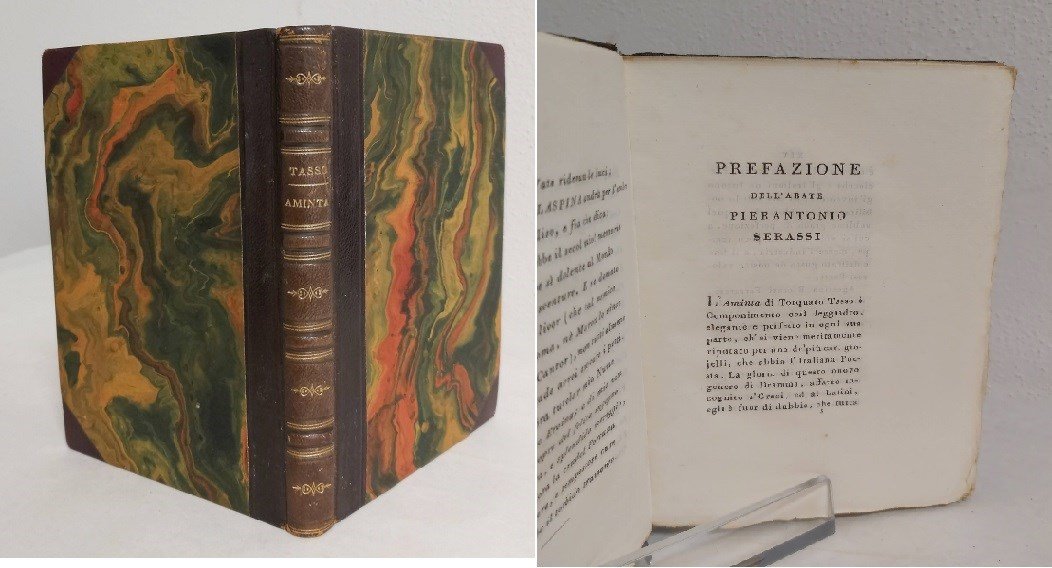 in-8, 1 cb, pp. XLIV, 150, 2 cb, pregevole leg. m. pelle coeva con tit. oro e fregi al d. a 4 nervi, angoli, piatti in carta marmorizz. Risguardi in carta dec. Elegante ediz. bodoniana del poema del Tasso già apparsa nel 1789 in formato in-4, ma ripubblicata in questa più rara edizione in occasione delle nozze tra Giuseppa Malaspina e Artaserse Bajardi, come si evince nelle note di prefazione del Bodoni. La prefazione del Serassi contiene invece interessanti note bibliografiche sulle edizioni dell'Aminta, sue rappresentazioni teatrali, traduzioni. Brooks 651. Gamba, 958, note: "Magnifica edizione [.] fu ridotto il testo a più severa lezione; e nella Scena II dell'Atto I, in luogo di Nuovi lumi ed Orfei, s'è sostituito Nuovi Lini ed Orfei". Ex libris. Splendido esempl. in barbe. [523]