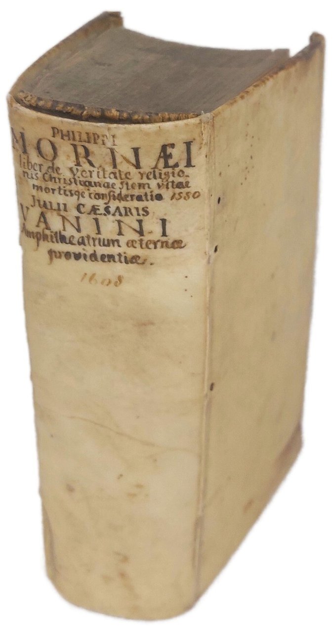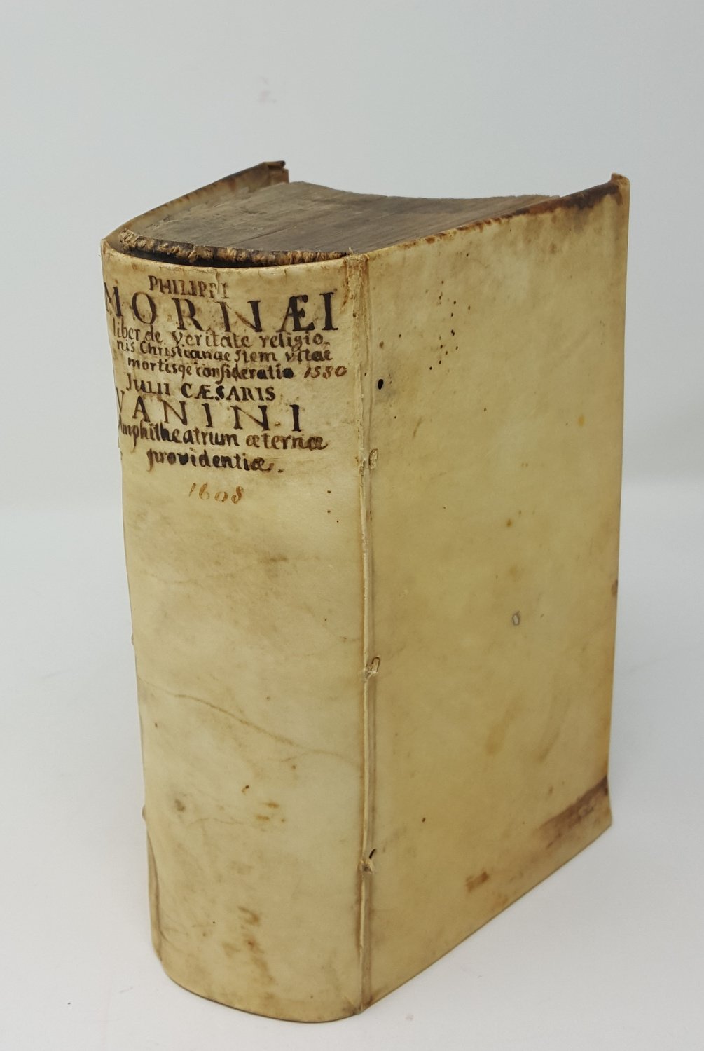 >tre opere in un tomo in-8 (170x105 mm), I) pp. (24), 568,(10); II) pp.60; III) pp. (12), 336, (8). Solida legatura del tempo piena pergamena rigida, titolo ms. al dorso. Edizioni originali di studi filosofici, polemico-religiosi, di fondamentale importanza e di grande rarità. In particolare l'opera del Vanini (di Taurisano, 1585-1619), è assai nota per il contenuto e per le vicende che portarono l'autore alla condanna. Ordinato prete a Padova, poi divenuto libero pensatore panteista; ricercato dalla giustizia dopo la pubblicazione della presente opera "Amphiteatrum Aeternae Providentiae", nella quale negava l'immortalità dell'anima, vagò in Inghilterra, Germania, Francia, Svizzera e Olanda, fu arrestato a Toulouse come ateo, accusato di essere astrologo e mago, processato e condannato, amputato della lingua ed arso vivo. La presente opera venne sequestrata dall'autorità di giustizia e distrutta. Gli esemplari superstiti sono estremamente rari. Esemplare assai genuino e bello (lieve e uniforme brunitura della carta). Caillet, Sciences psychiques et occultes, n.11028. Guaita n.2194. Choix d'Olschki, n.13621. Dorbon, Bibl. Esoterica, n. 4060: ''rarissime édition originale''.