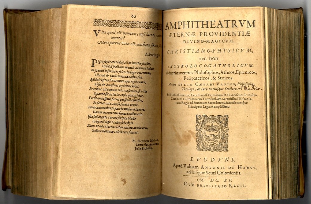 Amphiteatrum Aeternae Providentiae Divino-Magicum. Christiano-Physicum, nec non Astrologo-Catholicum. Adversus veteres Philosophos, Atheos... (legato con:) De Veritate Religionis Christianae liber, adversus Atheos Epicureos, Ethnicos, Judaeos, Mahumedistats, & caeteros Infideles...Gallice primum conscriptus, Latrinae versus...accuratissimae correctus. (e:) Vitae Mortisq. atq.Adeo humanarum actionum christiana ac pia consideratio.