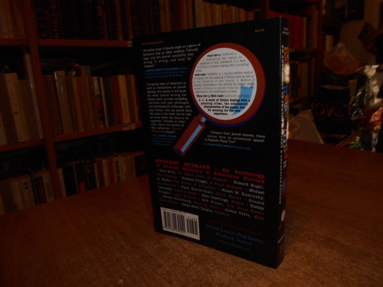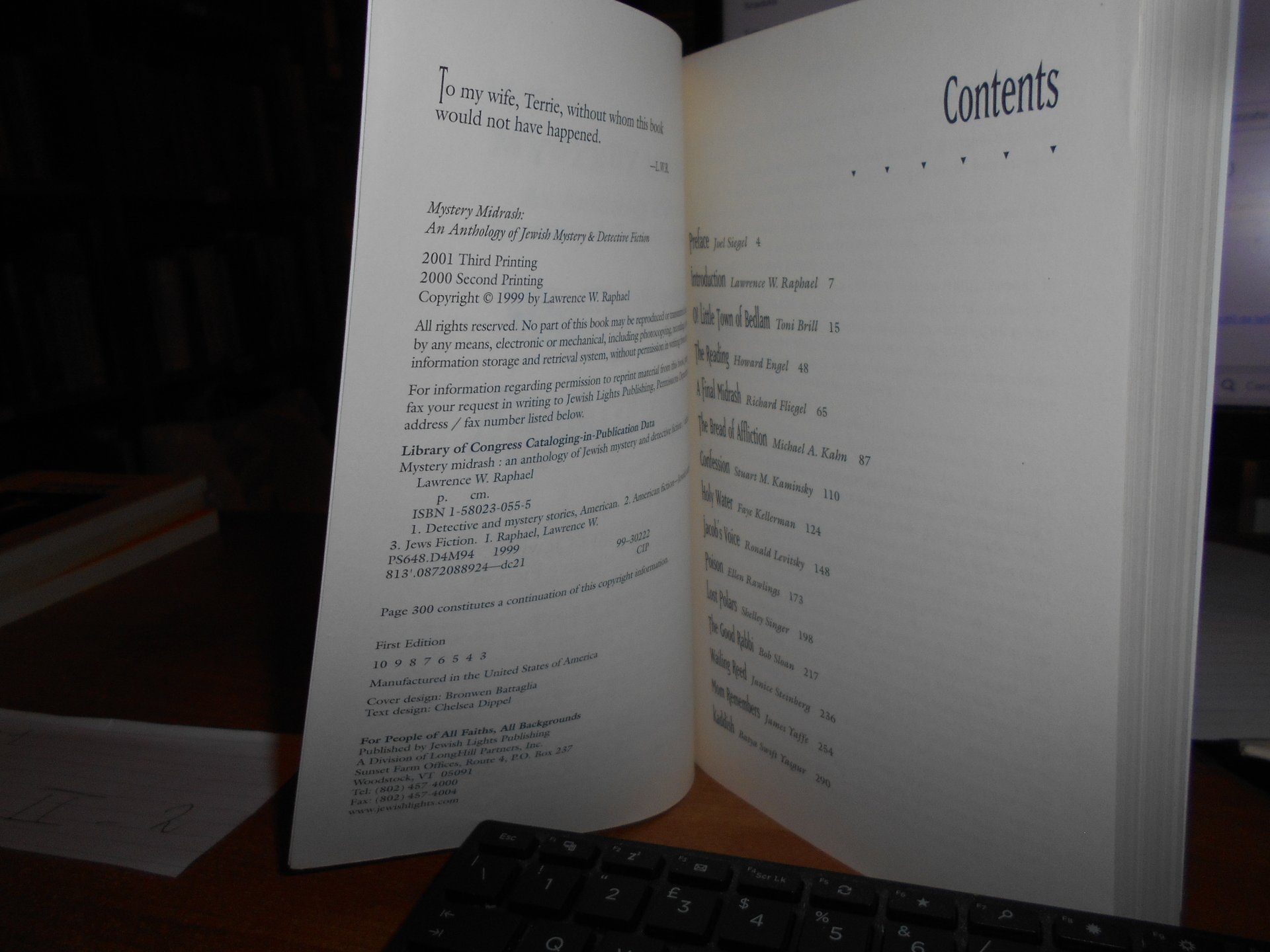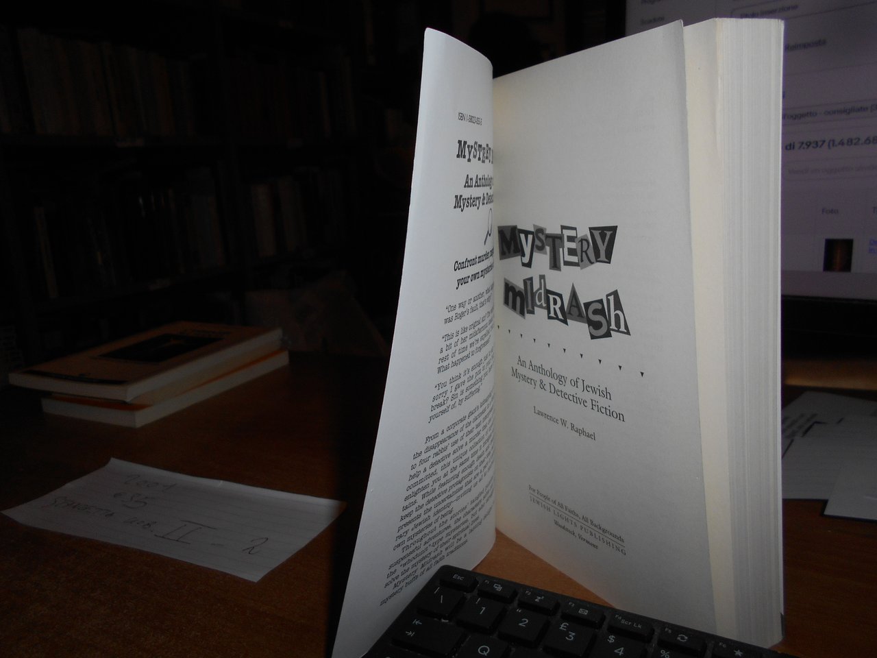 Lawrance W. Raphael. Wodstock, Jewish Lights Publishing, 2001. An Anthology of Jewish Mystery & Detective Fiction. Preface by Joel Siegel. In-8°, br. ill. a col. 300 pp. In ottimo stato con testo in inglese. Uff. stanzetta a sinistra mob. II - 2