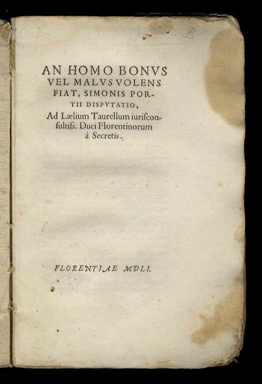 An homo bonus vel malus volens fiat, Simonis Portii disputatio, ad Laelium Taurellium iurisconsultis, Duci Florentinorum a Secretis.