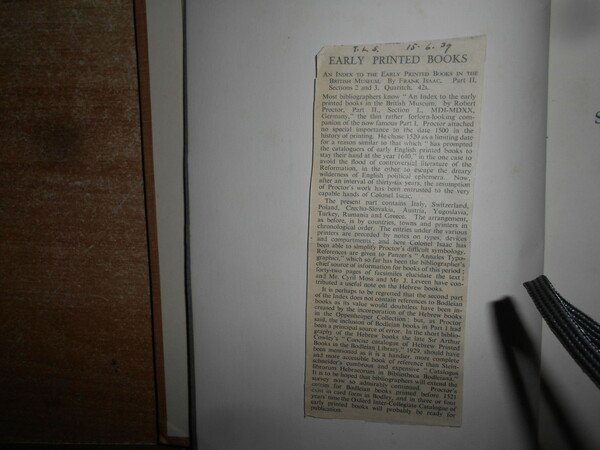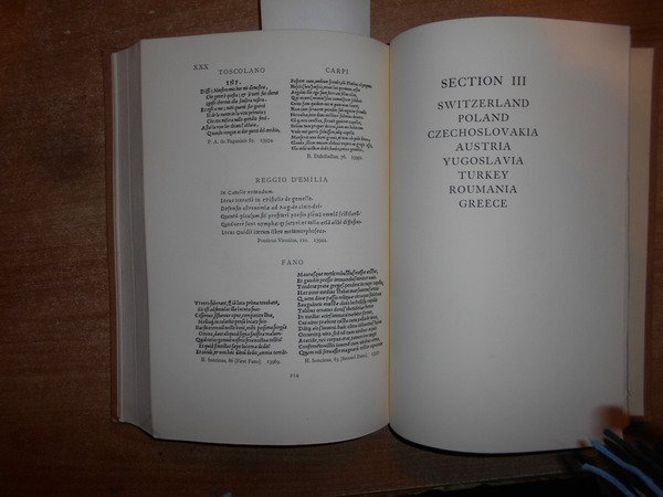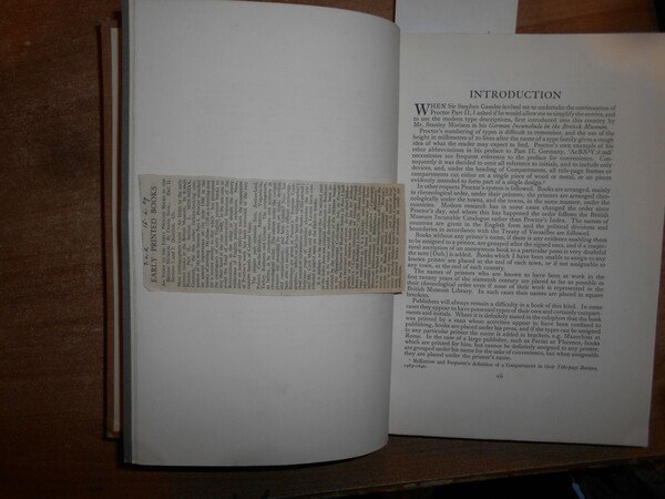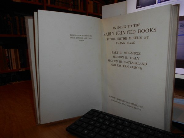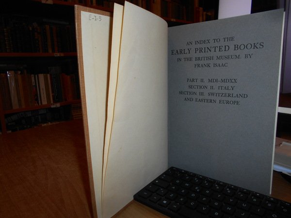 by FRANK ISAAC. London, Bernard Quaritch, 1938. An Index to The Early Printed Books in The Brtitish Museum. Part II. MDI-MDXX Section II. Italy Section III. Switzerland and Eastern Europe. In-8° grande, m. pelle con dorso a nervi e titolo in oro, copertine originali conservate. XV, 286 pp. con numerosi facsimili n.t. Ottimo esemplare in bella legatura con le brossure originali conservate con testo in inglese. Uff. E - I - 5
