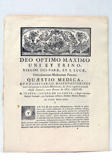 8 pages. (26x20 Cm). Dérelié. Cette thèse traite du traitement de la Variole par l'eau chaude d'origine thermale. L'auteur était originaire de Joigny (Yonne). Jolie vignette de titre évoquant un bain thermal. Très rares rousseurs.