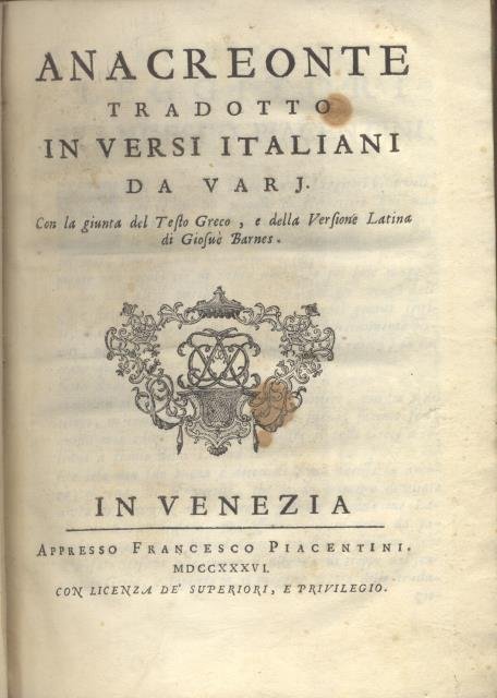 ANACREONTE TRADOTTO IN VERSI ITALIANI DA VARJ. Con la giunta del Testo Greco, e della Versione Latina di Giusuè Barnes.
