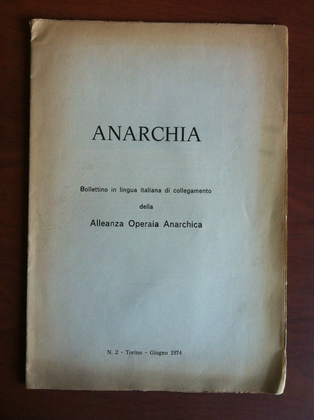 ANARCHIABollettino in lingua italiana di collegamento dellaAlleanza Operaia Anarchica n^2 Torino Giugno 197416 pagine - formato 17,5x25,5 cmin ottime condizioni (25 g) E19695