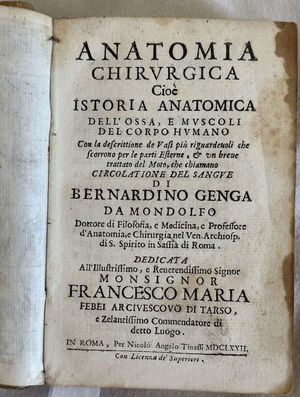 Prima edizione del 1672 di questa opera, una pietra miliare nel campo della chirurgia del medico e anatomista Bernardino Genga (Mondolfo 1620 - Roma 1690). Bernardino Genga (1620-1690), fu uno dei più celebri anatomisti e studiosi di medicina del seicento e uno dei massimi esperti delle opere di Ippocrate della sua epoca. Fu tra i primi ad esprimersi in favore dell'insegnamento della circolazione del sangue. Tra i suoi interessi grande rilievo ebbero la preparazione di preparati anatomici, nonché l'anatomia della scultura antica greca e romana. Nato a Mondolfo nel Ducato di Urbino praticò l'arte chirurgica presso l'Ospedale di Santo Spirito in Sassia. Nell'opera qui presentata Genga sottolinea l'importanza della conoscenza dell'anatomia umana da parte dei chirurghi indicando diverse tecniche chirurghe e descrivendo casi pratici anche nell'ambito della odontoiatria. "the first book devoted entirely to surgical anatomy" Rif. Garrison-Morton 384. Bella incisione in antiporta. Antiche note manoscritte all'ultima carta. In buone condizioni. Copertina in piena pergamena floscia coeva con titolo manoscritto al dorso in discrete condizioni generali con lievi usure ai margini e dorso. Macchie. Legatura in buone condizioni ma corpo del libro in parte staccato dalla legatura. Pagine in buone condizioni con fioriture. In 16. Dim. 16,5x11 cm. Pp. (13)+455+(3). First edition of 1672 of this work, a milestone in the field of surgery by the physician and anatomist Bernardino Genga (Mondolfo 1620 - Roma 1690). Bernardino Genga (1620-1690), was one of the most famous anatomists and scholar of meedicine of 17th century and one of the most important experts of works of Hyppocratis of his time. He understood the importance of teaching of circulation of blood. He was really interested about antique roman and greek sculptures. He was born in Mondolfo in Ducato di Urbino and practiced surgery in the Hospital of Santo Spirito in Sassia. In this work Genga underlines the improtance of human anatomy by surgeons indicating different surgical techniques and describing practical cases in the field of teeth care "the first book devoted entirely to surgical anatomy" Rif. Garrison-Morton 384. Beautiful engraving in the frontspice. Antique handwritten notes in the last page. In good conditions. Full parchment coeval cover with handwritten title in the spine in fair general conditions lightly worn in the extremities. Stains. Binding in good conditions but the body of the book partially detached from binding. Inside pages are in good conditions with foxing. In 16. Dim. 16,5x11 cm. Pp. (13)+455+(3).