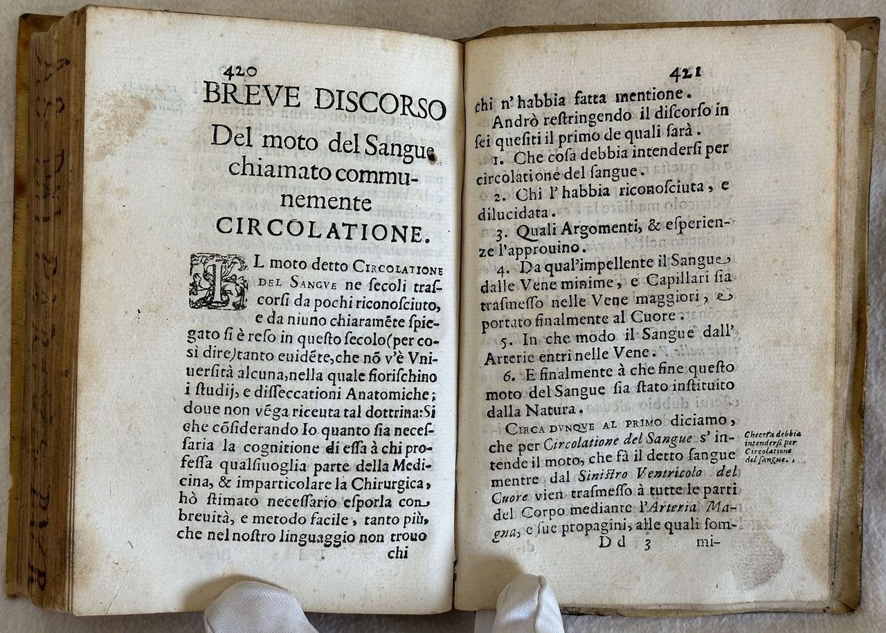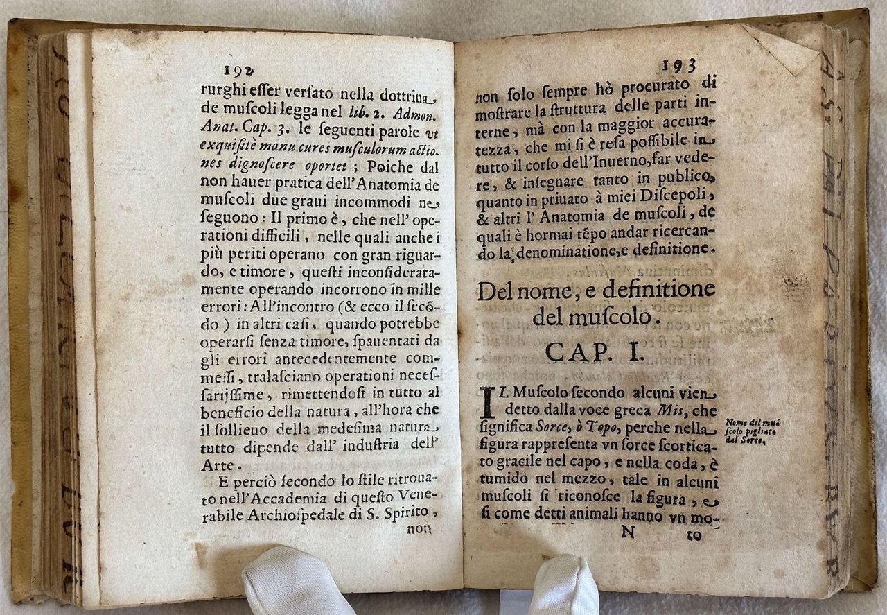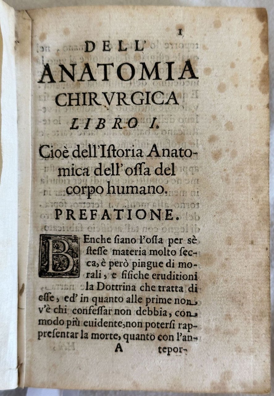 ANATOMIA CHIRURGICA CIOE ISTORIA ANATOMICA DELL'OSSA E MUSCOLI DEL CORPO HUMANO CON LA DESCRITTIONE DE VASI PIU RAGUARDEVOLI CHE SCORRONO PER LE PARTI ESTERNE & UN BREVE TRATTATO DEL MOTO, CHE CHIAMANO CIRCOLATIONE DEL SANGUE