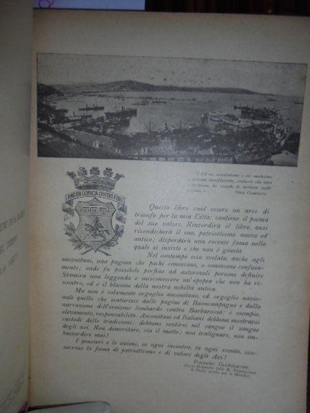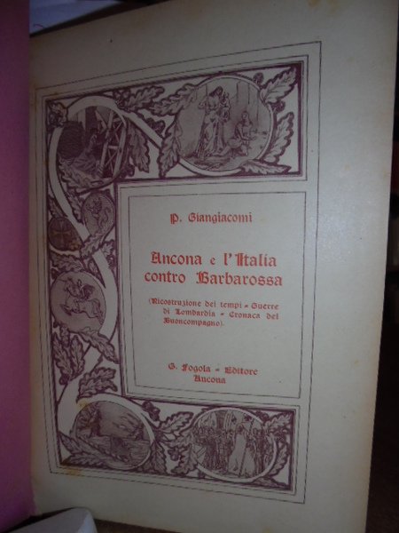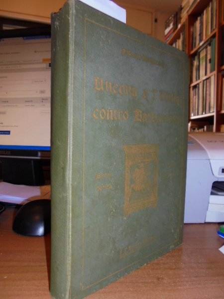 Ancona e L' Italia contro Barbarossa. (Ricostruzione dei tempi - Guerre di Lombardia - Cronaca del Buoncompagno). Giangiacomi Palermo. Ancona, Stabilimento Tipografico già Cooperativo. G. Fogola Editore, s.d., 1927. In-8°, tela edit. con fregi e titolo in oro sul piano. 443, (1) pp. Frontespizio contornato da bordura con figure allegoriche, con una tavola ripiegata f.t. e innumerevoli illustrazioni n.t. Esemplare ben conservato con macchia marron di incollatura nella parte inferiore dell' ultima pagina (errata corrige) come da foto. Neg. Mob. 7