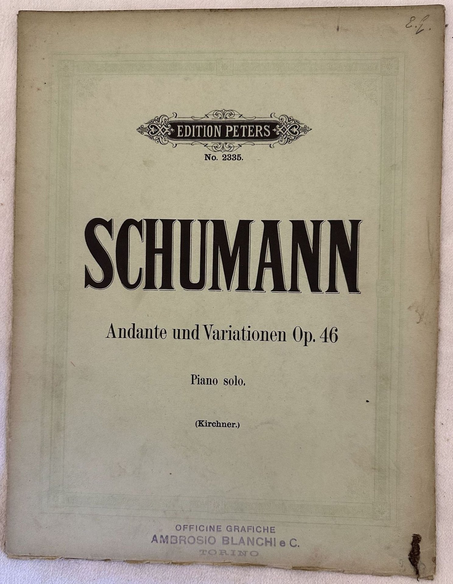 Edizione della fine dell'ottocento o inizio novecento della melodia per pianoforte "Andante und Variationen" dall'opera 46 di Robert Schumann rivista da Theodor Kirchner.Bella copertina editoriale illustrata. Note manoscritte. In buone condizioni. Copertina editoriale in buone condizioni generali con lievi usure ai margini. Legatura in buone condizioni. Pagine in buone condizioni con rare fioriture. In 4. Formato cm. 31x24. Pp. 15. Edition of late 19th century of early 20th century of the melody for piano "Andante und Variationen" from the opera 46 by Robert Schumann reviewed by Theodor Kirchner. Beautiful editorial illustrated cover. Handwritten notes. In good conditions. Editorial cover in good general conditions lightly worn in the extremities. Binding in good conditions. Pages in good conditions with occasional foxing. In 4. Formato cm. 31x24. Pp. 15.