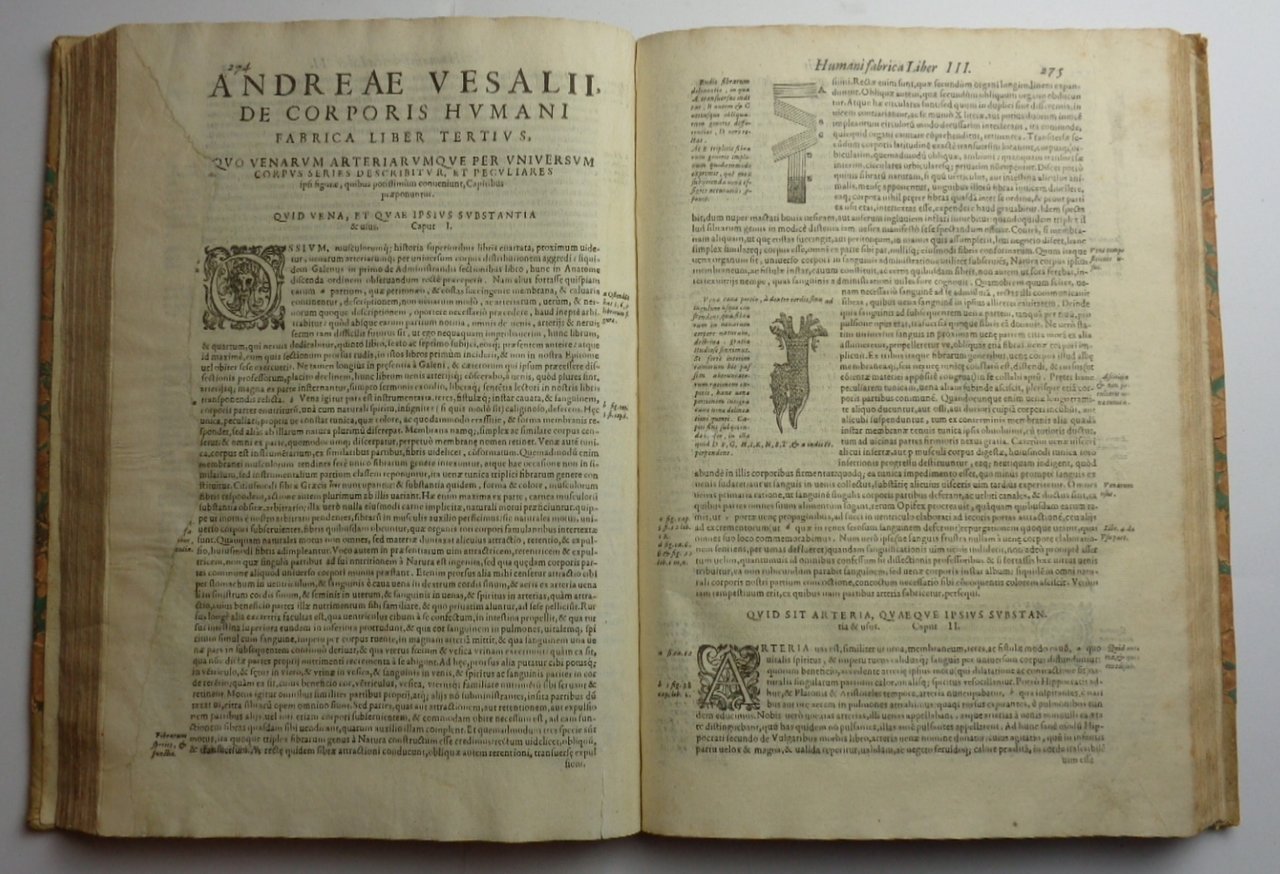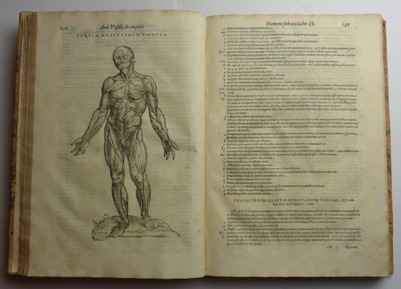 Un volume (22x33 cm) di (6)-510-(46)-(20) pagine, con le incisioni nel testo e a piena pagina di Joannes Criegher dagli originali vesaliani; pagina di titolo calcografica incisa da Francesco Valesio (rinforzata al retro); manca la pagina di occhiello (?1). L'ultima pagina è bianca. Alla p. 273-74 strappo restaurato al margine esterno con perdita di alcune lettere e delle due glosse. Piccolo foro di tarlo al margine bianco interno agli ultimi tre fogli della seconda parte. Per il resto esemplare molto bello, con poche fioriture, incisioni assai nette e fresche. -Legatura settecentesca in mezza pergamena , tassello di titolo (parzialmente eraso) al dorso, piatti con carta marmorizzata. -Quinta edizione, assai simile alla quarta del 1588 pubblicato da Francesco Sanese, veneziano padre degli stampatori di questo volume che però aggiungono per la prima volta l' Universa Antiquorum anatome tam ossium, quam partium & externarum, & internarum: ex Rufo Ephesio medico antiquissimo: tribus tabellis explicata per Fabium Paulinum. Quibus accessit quarta ex Sorani medici antiquissimi fragmento Graeco non antehac Latino facto. Di 19 pagine non numerate + una bianca. "The sons of Francesco Senense must have come into possession of Crieghers carefully engraved wood-blocks and when in 1604 their fathers edition of 1568 presumably became sold out, they decided to issue another in precisely the same format . . . Fabricius of Acquapendente was by now professor of anatomy at Padua, and it was in all likelihood the student text he recommended. Additions to the book were a title-page handsomely engraved on copper and an additional series of anatomical tables with a new title-page and privilege giving the date of publication which was absent on the frontispiece" (Cushing, p. 93). Cushing, A Bio-bibliography of Andreas Vesalius, VI.A-5
