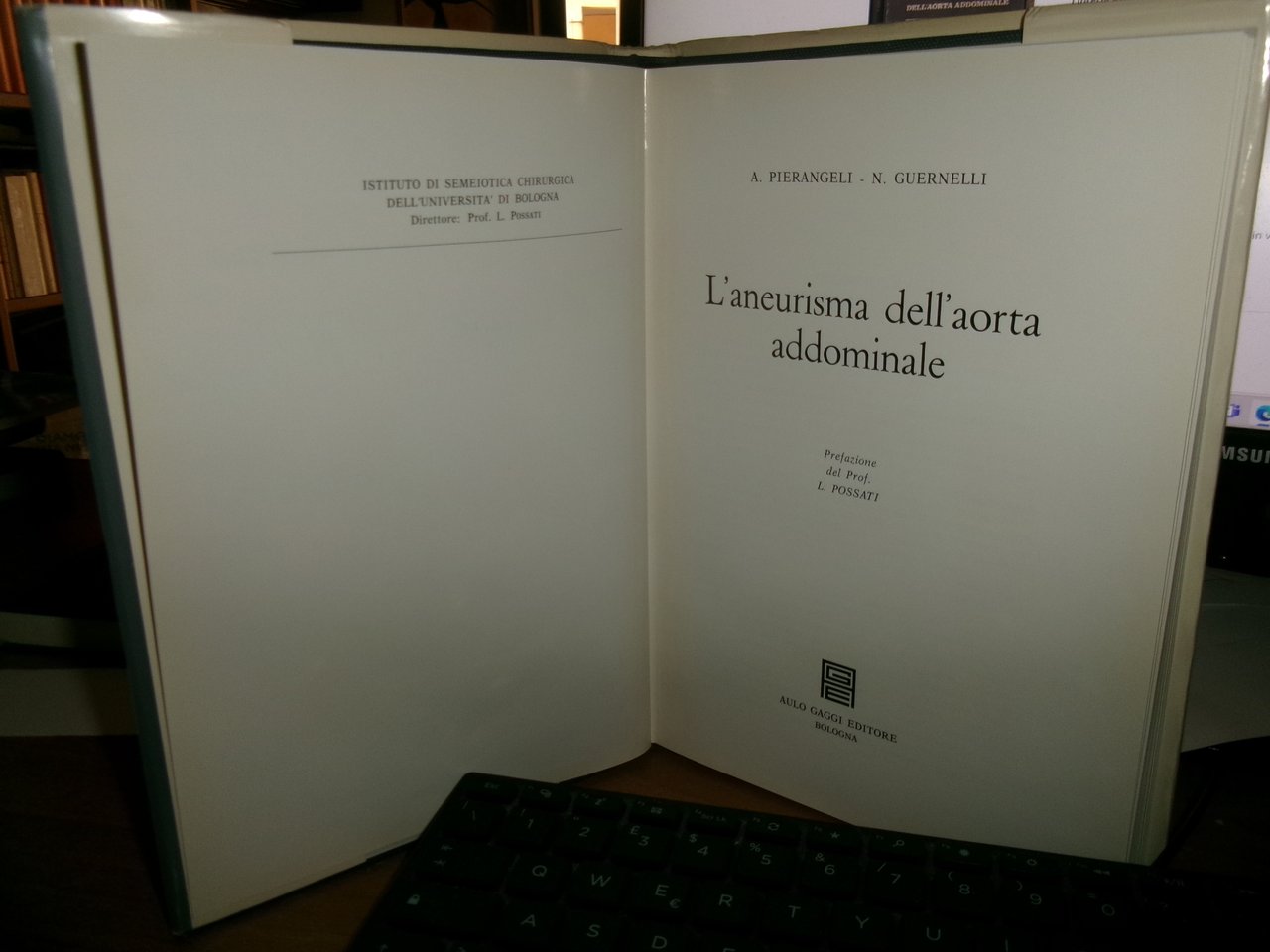 A. PIERANGELI - N. GUERNELLI. Bologna, Aulo Gaggi Editore, 1967. ANEURISMA DELL'AORTA ADDOMINALE. Prefazione del Prof. L. Possati. In-8°, tela edit. con titoli in oro, sovracopertina. 186 pp. con numerose illustrazioni a colori e in bianco e nero. n.t. ex libris. In ottimo stato di conservazione con una dedica firmata dagli autori nella seconda bianca. Uff. C - IV - 6