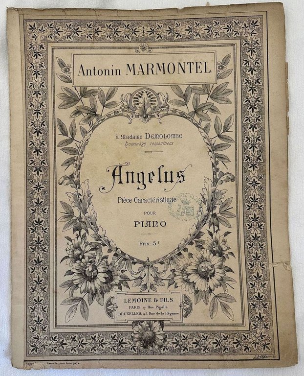 Edizione della fine dell'ottocento della melodia "Angelus" dell compositore francese Antoine Francois Marmontel (1816-1898). In discrete condizioni. Copertina editoriale in discrete condizioni con lievi usure marginali. Strappi marginali. Legatura editorialmente assente. Pagine in buone condizioni con rare fioriture. In 4. cm.35x27. Pp. 5.Edition of late 19th century of the melody "Angelus" by the french composer Antoine Francois Marmontel (1816-1898). In fair conditions. Editorial cover in good conditions lightly worn in the extremities. Tears in the extremities. Binding is editoriarly missing. Pages in good conditions with occasional foxing.In 4. cm.35x27. Pp. 5.