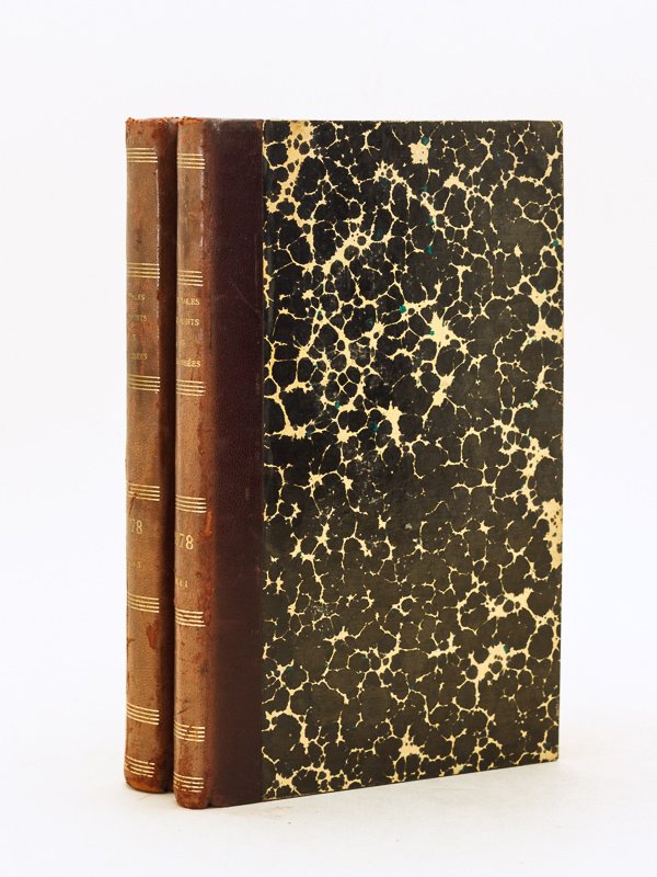 2 vol. in-8 reliure de l'époque demi-basane marron, Dunod, Paris, 1878, pp. 362-613 et pp. 617-882 et pp. avec 4 grandes planches dépliantes hors texte [ Contient : ] Notice nécrologique sur M. Homberg - Mémoire sur l'Alimentation en eau des agglomérations de l'arrondissement de Lille par Menche de Loisne - Mémoire sur l'éclairage des villes par M. Darcel - Notice historique sur le nivellement général du Nord et sur la carte au 40.000e annexe de cette opération par M. Raillard - Canal de la Marne au Rhin. Exhaussement du Pont de la Station de Frouard par M. A. Picard Bien complet des 4 planches dépliantes hors texte sur l'Alimentation en eau des agglomérations de l'arrondissement de Lille, sur l'éclairage des villes et sur le nivellement général du Nord et l'Exhaussement du Pont de la Station de Frouard. Etat très satisfaisant (dos un peu frottés, mouill. intérieure discrète n'affectant pas les planches dans le second volume)