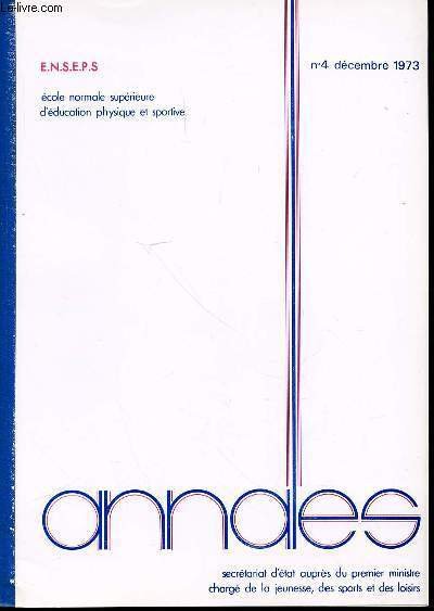 ANNALES N°4 DECEMBRE 1973 - ACTION MOTRICE ET FACULTE D'ADAPTATION / EVOLUTION DES MOTIVATIONS ENTRE 11 ET 18 ANS / ASPECTS PERCEPTIVO-MOTEUR DES SPORTS DE BALLE / ETC.