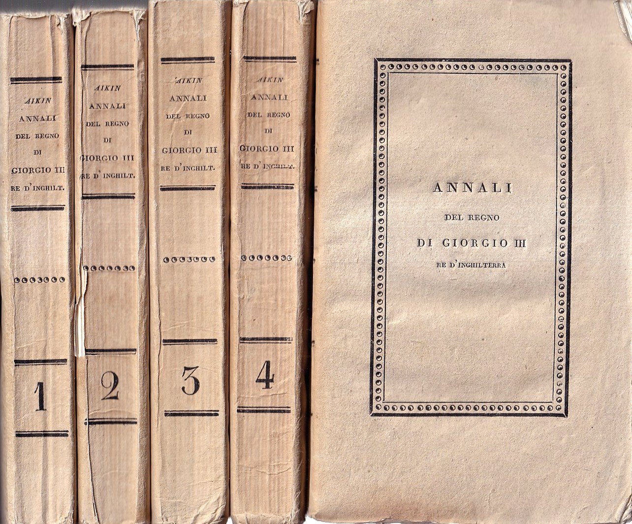 Opera del Sig. Aikin continuata dal Sig. Theremin e trasportata in lingua italiana dal prof. G. Barbieri - Opera completa in cinque volumi nelle loro brossure originali, rispettivamente di xii-340, 369, 378, 365 e 307 pagine. Esemplari complessivamente in ottimo stato di conservazione, specie considerata l'età.