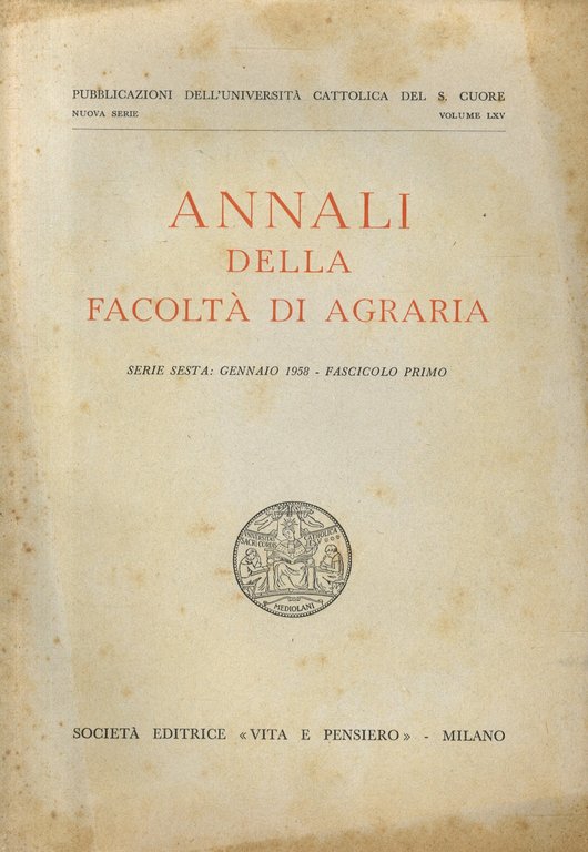 Milano, Società Editrice "Vita e pensiero", 1958, in-8, br. editoriale, pp. 151, [15]. "Pubblicazioni dell'Università Cattolica del S. Cuore. Dall'indice: Marchesi G. "Confronti fra cultivar di pomodoro", Ulivieri T. "L'impiego della urea corretta nell'alimentazione delle vacchie da latte".
