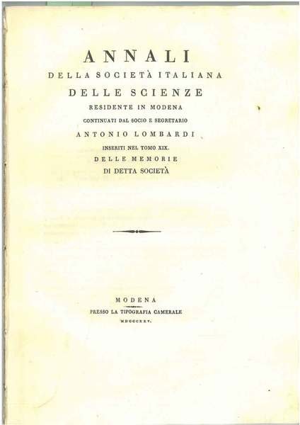 Annali della società italiana delle scienze residente in Modena continuati dal socio e segretario Antonio Lombardi Inseriti nel tomo XIX delle memorie di detta società