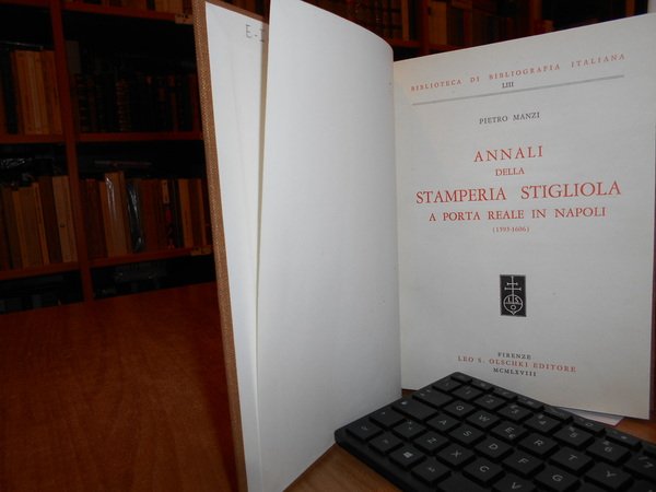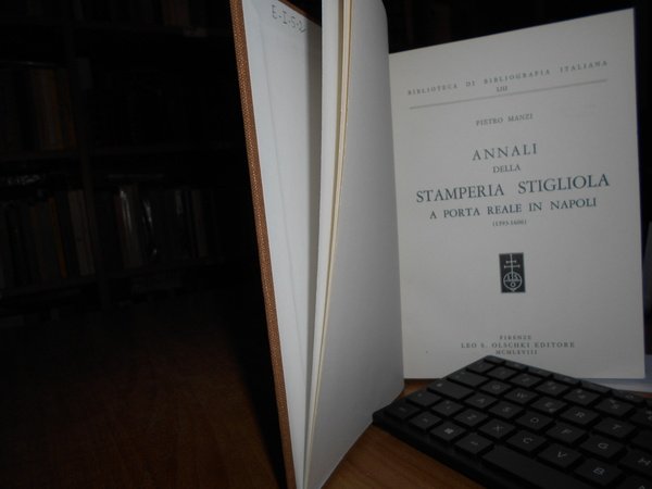 Manzi Pietro. Firenze, Leo S. Olschki Editore, 1968. ANNALI della Stamperia Stigliola a Porta Reale in Napoli (1593-1606). In-8°, tela con titoli in oro su doppio tassello al dorso. xv, 99, (1) pp. con numerose riproduzioni in 27 tavole fuori testo. Come nuovo in legatura recente con le copertine originali conservate. Uff. E - I - 5 - 2