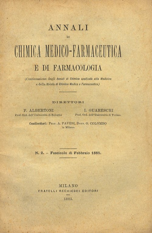 ANNALI di chimica medico-farmaceutica e di farmacologia. Direttori P. Albertoni, I Guareschi. Volume I della serie IV. Volume II della serie IV. 1885. Fascicoli da 1 a 12 divisi in due serie di sei, una per semestre. Annata completa.