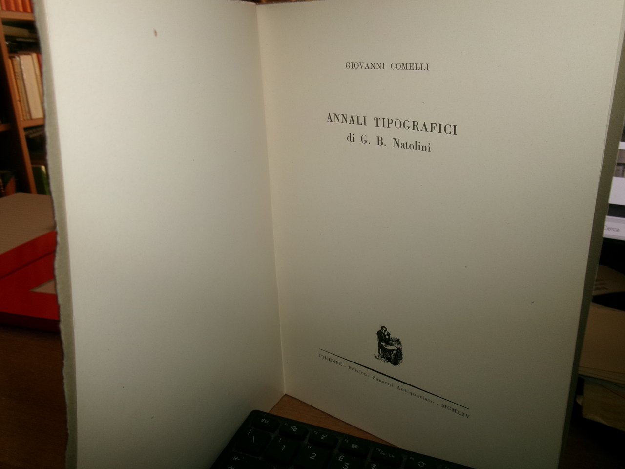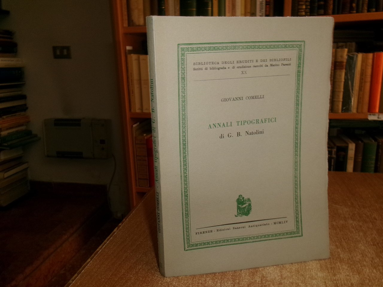 GIOVANNI COMELLI. Firenze, Sansoni Antiquariato, 1954. ANNALI TIPOGRAFICI di G. B. Natolini. In-8°, br. edit. 90 pp. con fac-simili e illustrazioni n.t. Come nuovo. Neg. mob. 11 entro busta trasp.