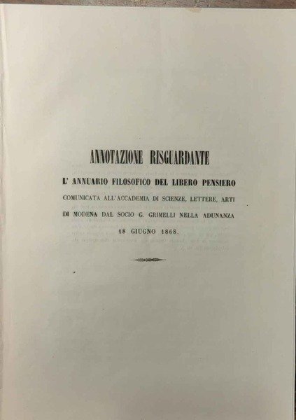 Annotazione risguardante l'annuario filosofico del libero pensiero comunicata all'Accademia di Scienze, Lettere, Arti di Modena. nella adunanza 18 giugno 1868