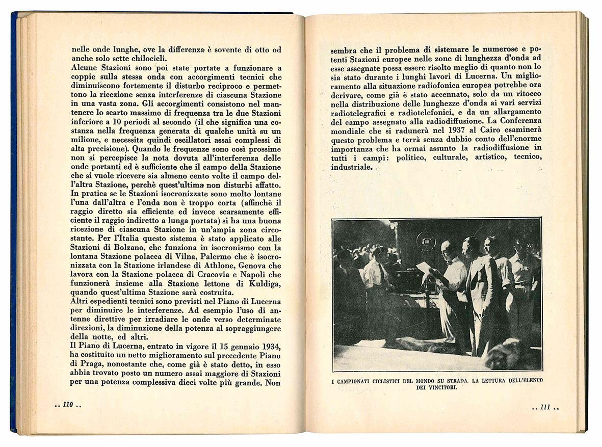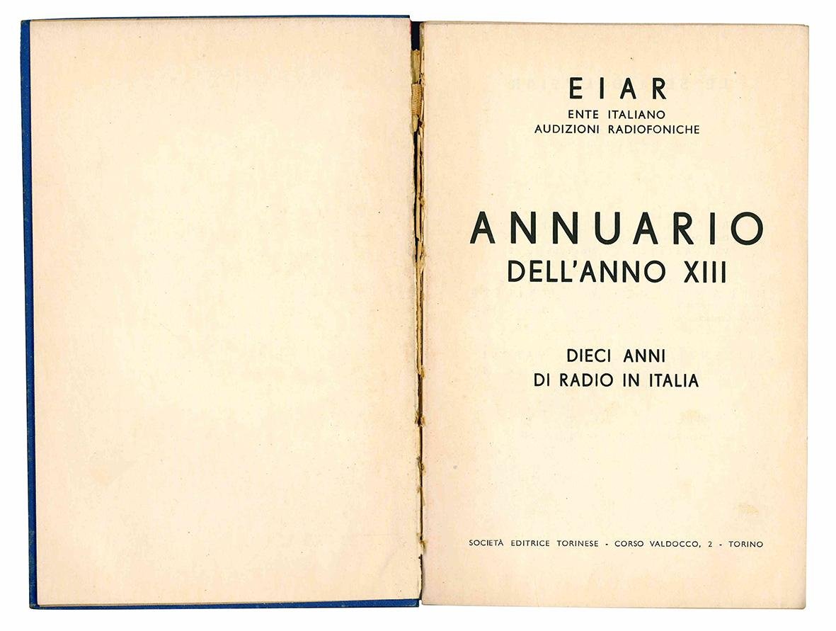 In 16mo (mm 179x119); pp. 478, [2], con numerose illustrazioni in bianco e nero nel testo. Tela editoriale blu con impressioni a secco e in oro al piatto anteriore. Lievi abrasioni ai piatti, un po' sciolto. Dettagliato annuario dei primi dieci anni di trasmissioni radiofoniche in Italia. Molto interessante.