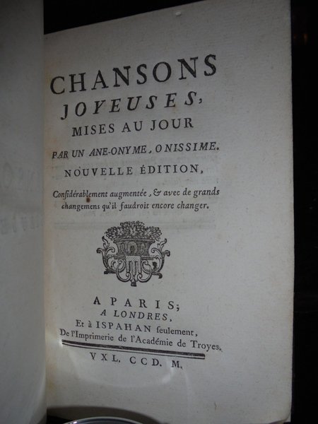 (MONNET, Jean). (Paris, Barbon), 1765. Anthologie françoise, ou Chanson choisies, depuis le 13 siècle jusqu'à présent. (Precedute da:) Mémorie historique sur la chanson en géneral, et en particulier sur la chanson françoise par Meusnier de Querbon. 3 volumi in - 8°, piena pelle coeva, dorso e piani decorati in oro. I°: (8), 64, 318 pp., ritratto del Monet inciso in rame da Aug. de St. - Aubin su disegno del Cochin, e 2 tavole incise da Le Mire su dis. del Gravelot. II°: (2), 317 pp. con una tavola incisa in rame dagli stessi artisti. III°: (2), 320 pp. con una tavoloa incisa in rame dagli stessi artisti. (Segue unito:) Chanson joyeuses mises au jour par un ane - onyme (Collé). Nouvelle édition augmentée. A Paris, à Londres, et à Ispahan.de l' Imprimerie de l' Académie de Troyes, 1765. Volume in - 8°, stessa legatura. (4), 80, 16 pp. Tutti i volumi contengono testo delle canzoni e relativa musica. Esemplari in ottimo stato di conservazione. Barbier, I, 208 - 209. Cohen - Ricci, 723 - 724. Brunet, III, 1824: << Ce recueil n' a de valeur que lorsque le volume des chansons joyeuses s'y trouve joint >>. Uff. Mob. 2