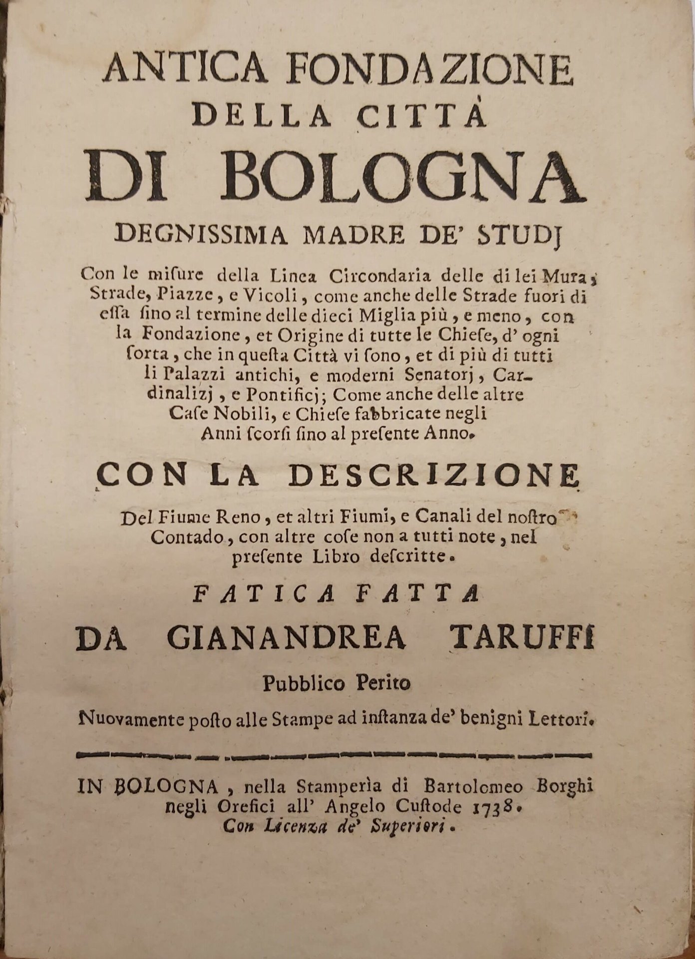 ANTICA FONDAZIONE della città di Bologna degnissima madre de' Studj. Con le misure della Linea Circondaria delle di lei Mura, Strade, Piazze, e Vicoli, come anche delle Strade fuori di essa sino al termine delle dieci Miglia più e meno, con la Fondazione et Origine di tutte le Chiese, d'ogni sorta, che in questa Città vi sono et di più di tutti li Palazzi antichi e moderni Senatorj, Cardinalizj, e POntificicj, come anche delle altre Case Nobili, e Chiese fabbricate negli Anni scorsi sino al presente Anno. Con la descrizione del Fiume Reno, et altri Fiumi e Canali del nostro Contado, con altre cose non a tutti note, nel presente Libro descritte.