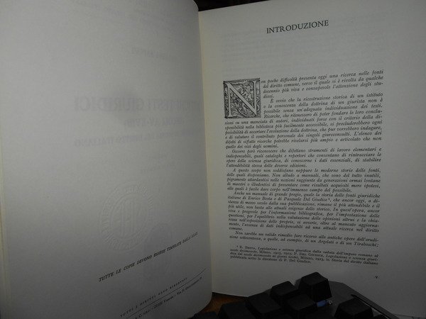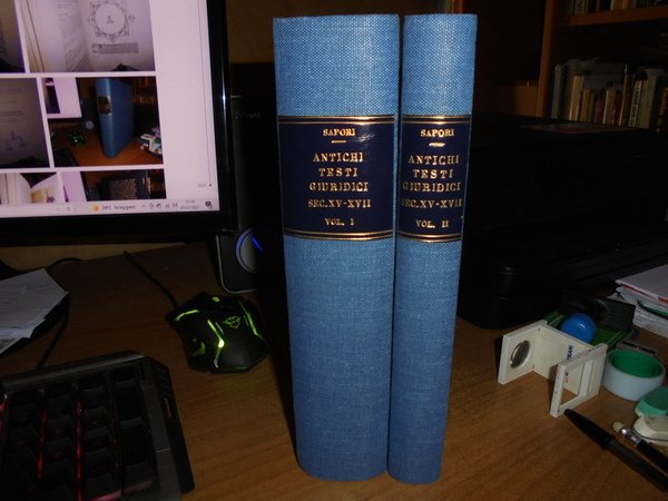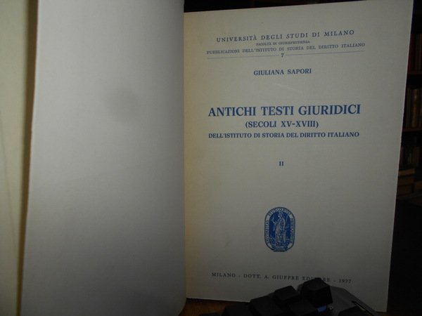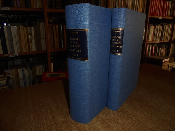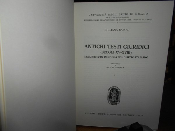 SAPORI GIULIANA. Milano, Dott. A. Giuffrè Editore, 1977. ANTICHI TESTI GIURIDICI (SECOLI XV-XVIII) DELL'ISTITUTO DI Storia del diritto Italiano. Introduzione di Giulio Vismara. 2 volumi in-8°, tela azzurra con titoli in oro entro tasselli ai dorsi, tutte le copertine originali conservate. xxix, per complessive 1027 pp. (numerazione pagine continua). Numerose riproduzioni di figure antiche, capilettere, finalini, frontespizi, in italiano, prima edizione, come nuova. Appendice I: Atti processuali - Appendice II: Manoscritti - Appendice III: Elenco delle Opere del Senato Milanese andate smarrite - Indice dei fondi antichi - Indice cronologico - Indice delle località degli editori e dei tipografi - Indice delle opere, degli autori e dei curatori - Indice generale. Come nuovi in legatura recente con tutte le copertine originali conservate. Uff. A - II - 6