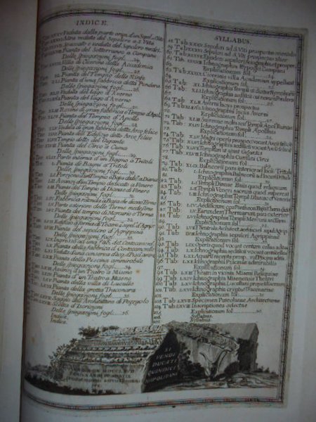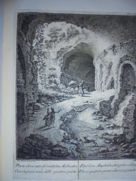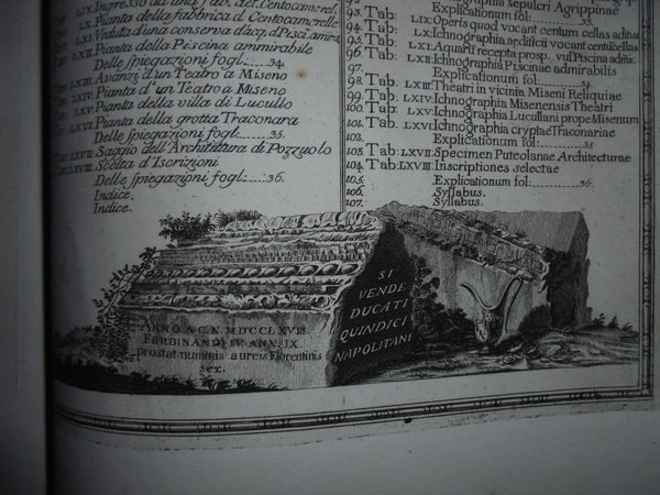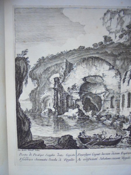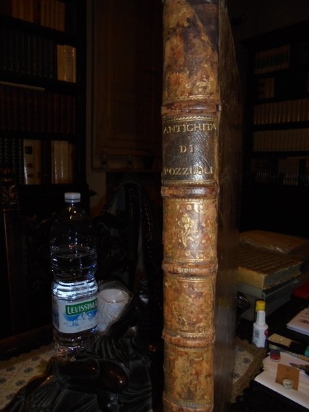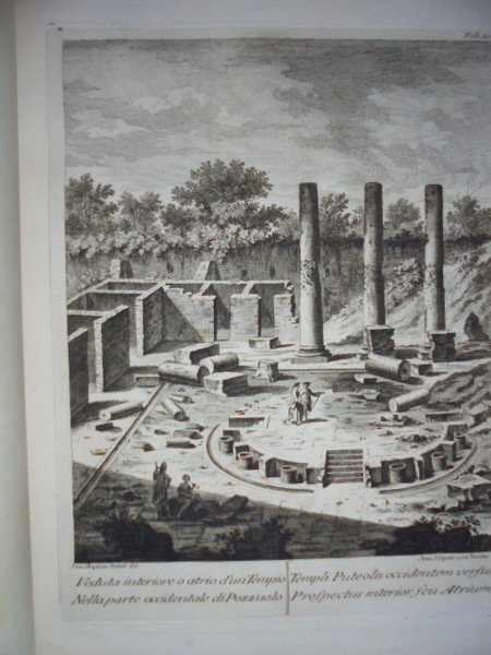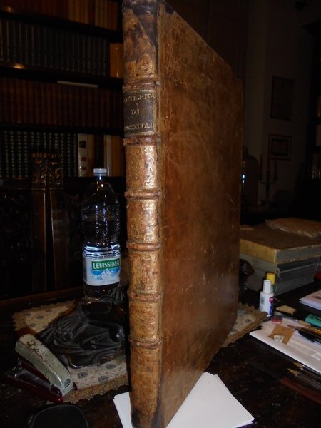 Antichità di Pozzuoli. Puteolanae Antiquitates. PAOLI, Paolo Antonio. Firenze? o Napoli?, 1768. In-folio massimo, piena pelle coeva. 69 tavole con veline protettive finemente incise in rame da vari illustri artisti, accompagnate da altrettanti fogli di testo esplicativo pure incisi in rame. Bellissimo esemplare di opera stupenda e molto rara. Edizione originale ed unica. Brunet, I, 314. Giustiniani, Bibl. storica e topogr. del Regno di Napoli, p. 145: << In 69 elegantissime tavole sono incise le vedute, le alzate, e le piante di quegli antichi edifizi, di cui se ne veggono tuttavia le rovine; e in altre 38 si contengono le spiegazioni giudiziose dell' autore in lingua latina ed italiana. Opera veramente pregevole >>. Manca al Lozzi, alla Bibl. Platneriana e al Cat. Bocca. Manca pure alla Bibl. Meridionalista della Bibl. Apulja. VENDIBILE SOLO IN ITALIA.