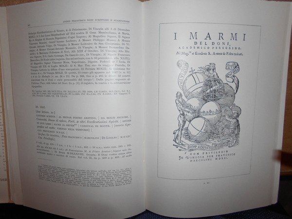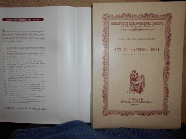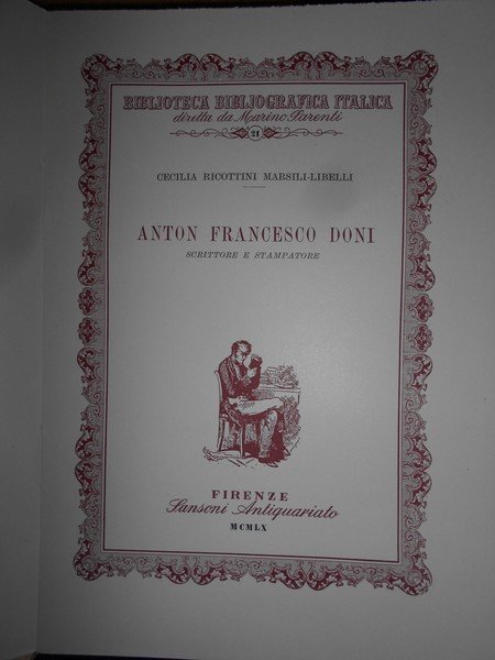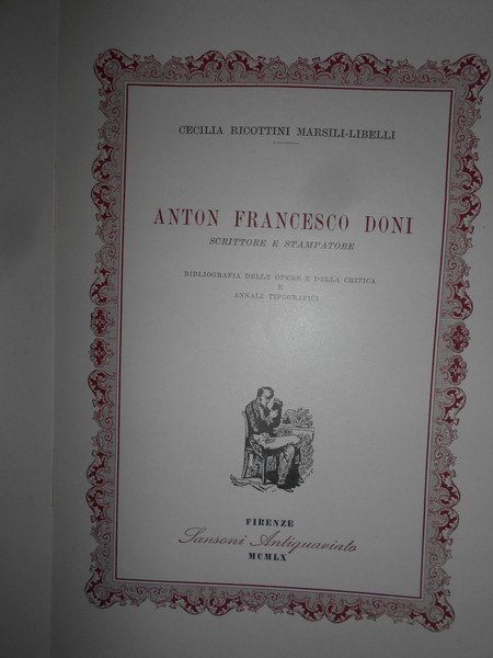 Cecilia Ricottini Marsili-Libelli. Firenze, Sansoni Antiquariato, 1960. ANTON FRANCESCO DONI Scrittore e Stampatore. In-8°, cart. edit. con sovracopertina. 401, (2) pp. con numerose riproduzioni. Astuccio con lievi segni del tempo. Libro come nuovo. Uff. E - I - 6 - 2