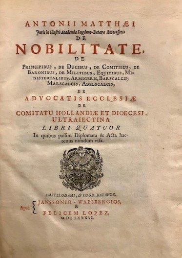 Antonii Matthaei juris in illustri Academia Lugduno-Batava. De Nobilitate, de Princibus, de Ducibus, de Comitibus, de Baronibus, de Militaribus, de Equitibus, de Ministerialibus, de Armigeris, de Barscalcis, Marscalcis, Adelscalcis, de Advocatis Ecclesiae, de Comitatu Hollandiae et Diocesi Ultraiectina Libri quatuor
