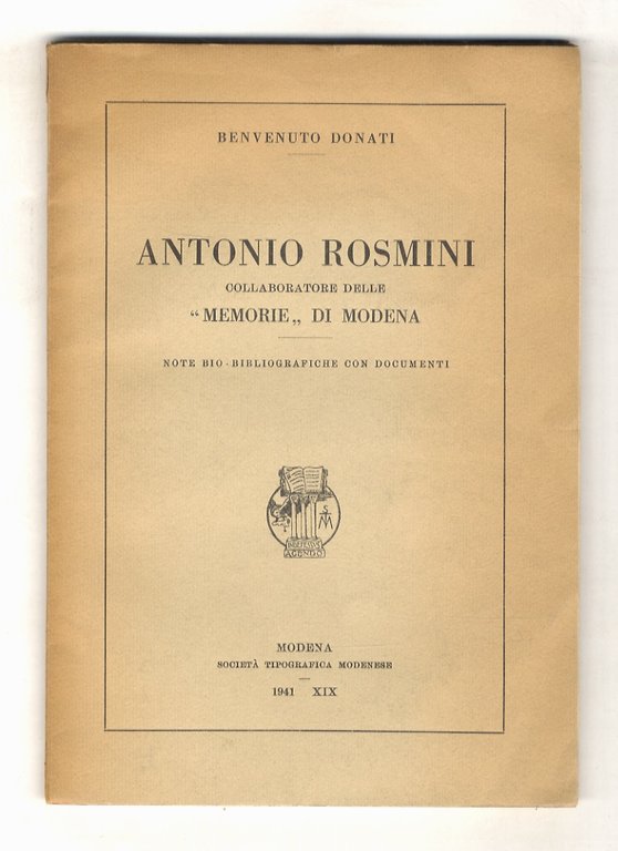 Modena, Società Tipografica Modenese, 1941, in-8, br. editoriale, pp. 84, [4]. Ricordi della permanenza del Rosmini a Modena.