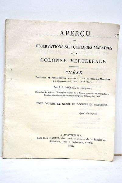 Aperçu et observations sur quelques maladies de la colonne vertébrale. Thèse présentée et publiquement soutenue à la Faculté de Médecine de Montpellier, le mai 1821.